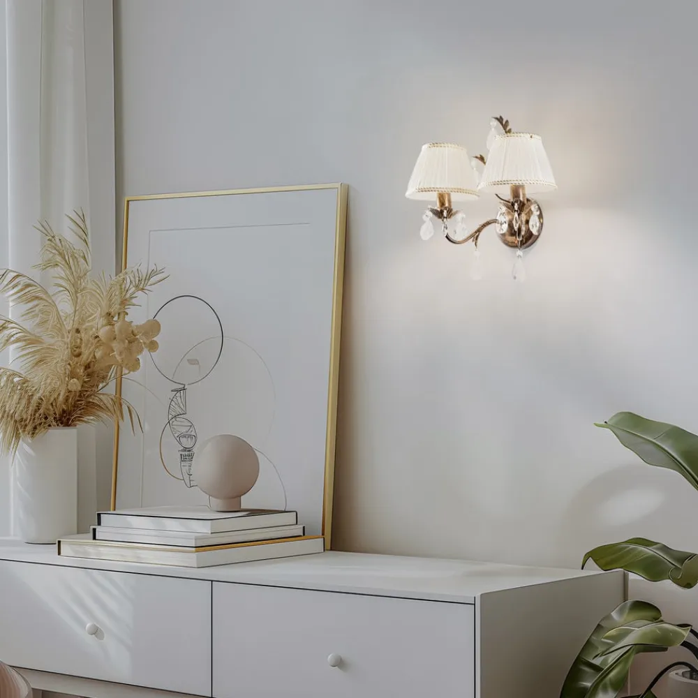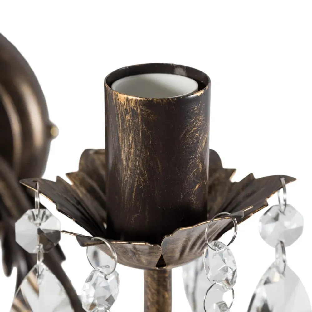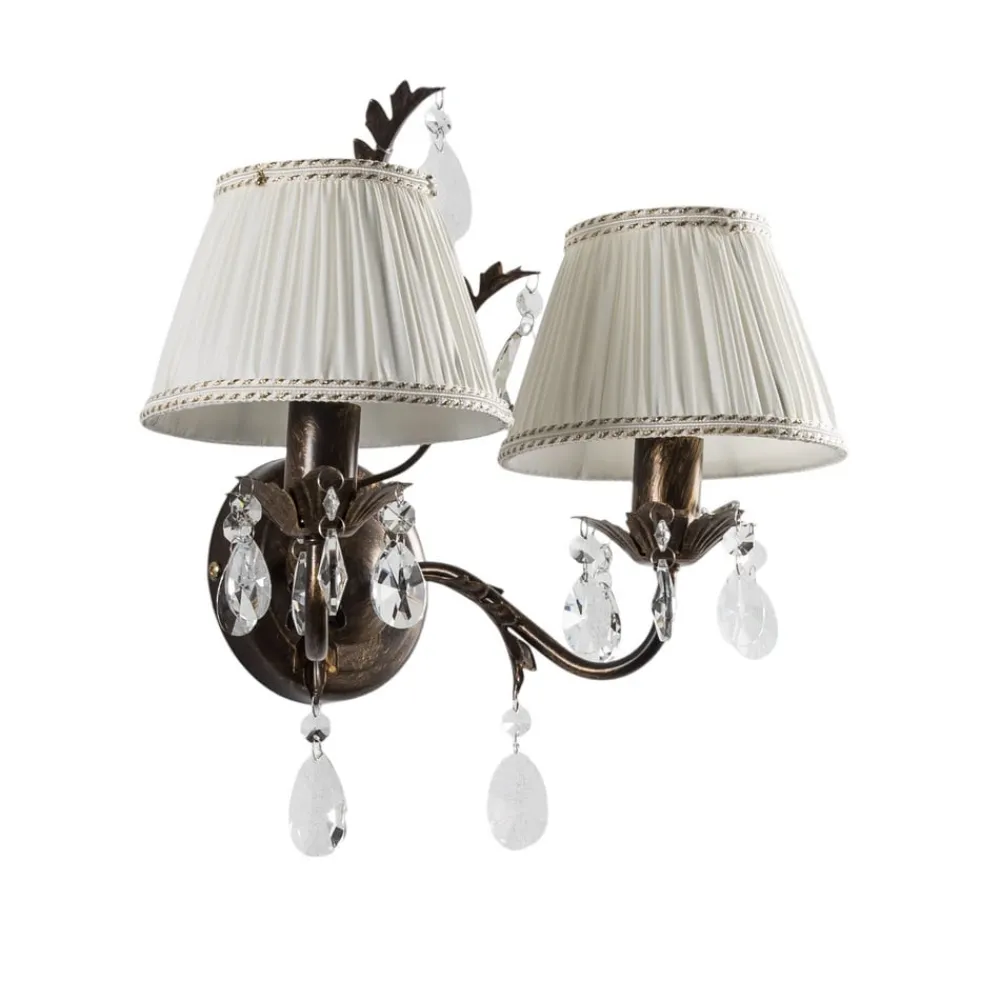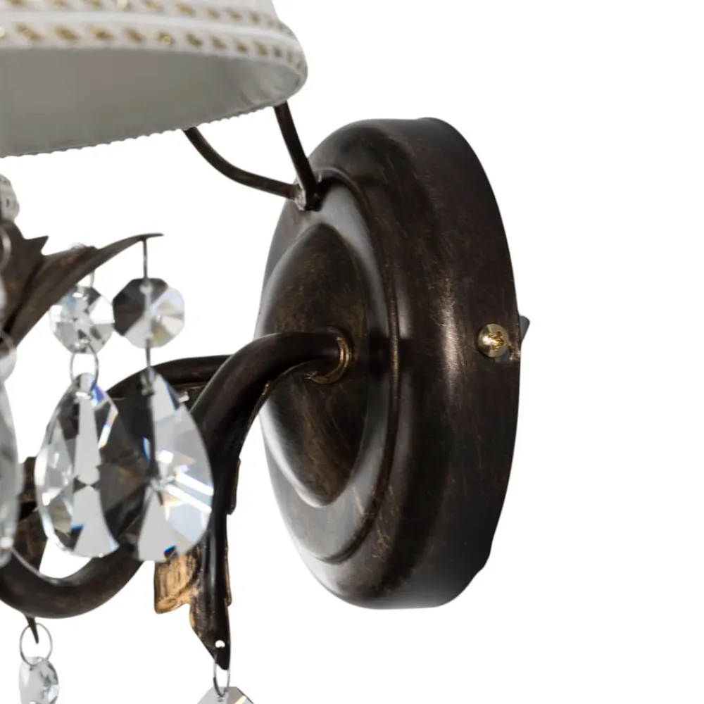To-lys Karen væglampe i bronze med tekstilskærme Karen væglampen er designet i stil med en lysekrone med en metalramme med buede arme og krystalpendler og to samlede skærme af lyst stof. I kombination med en lysekrone og andre lamper fra serien kan den bruges til at oplyse et helt rum på en stilfuld og romantisk måde.