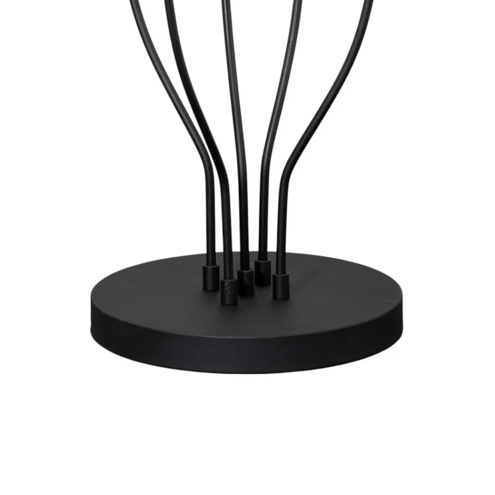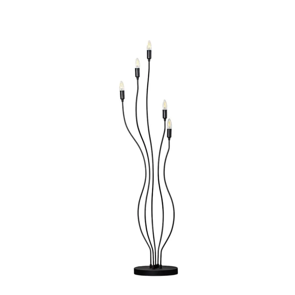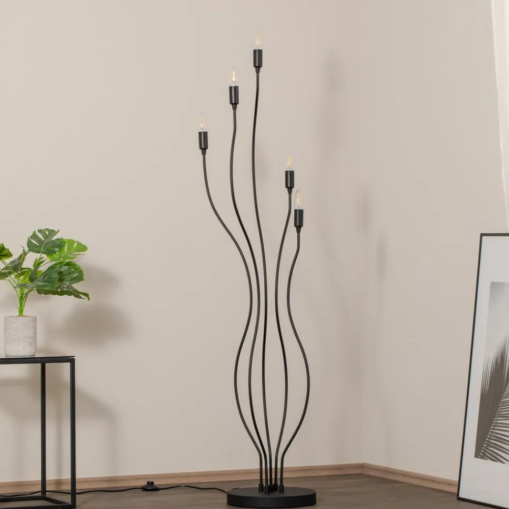 Gulvlampen Bonibon kombinerer moderne design med høj kvalitet og er fremstillet af robust metal. Den sorte farve giver den en tidløs elegance, der passer perfekt ind i forskellige indretningsstilarter. Med sin femflammede konstruktion sikrer den optimal belysning i stuer, spisestuer eller soveværelser og skaber en behagelig atmosfære, der kan virke både beroligende og inspirerende.
