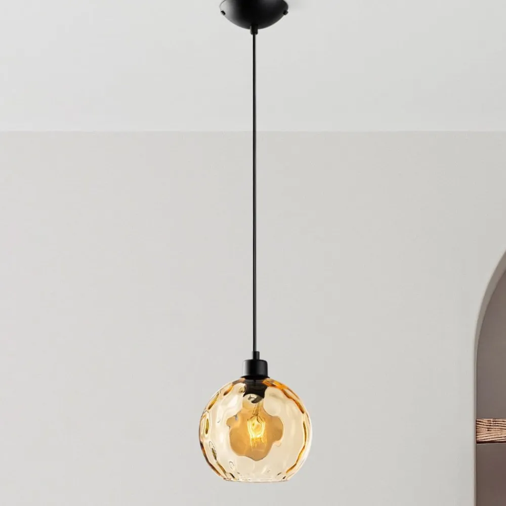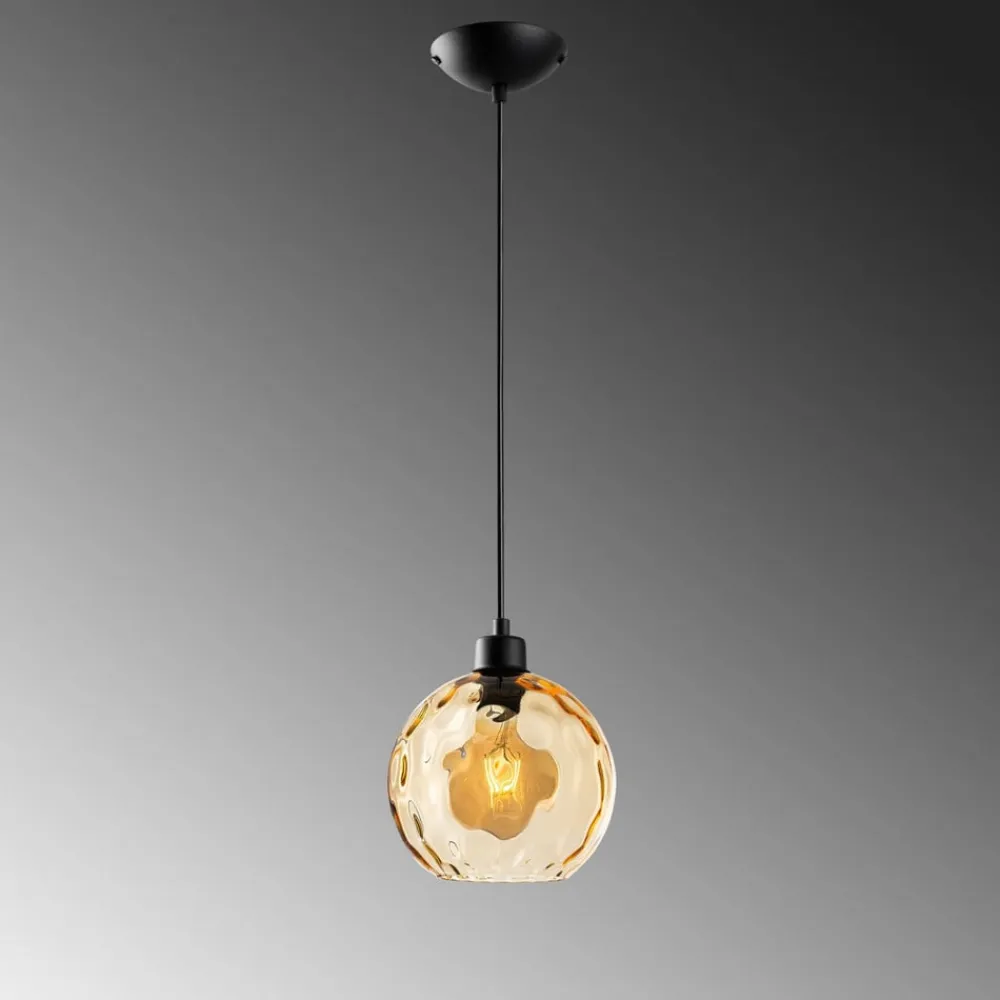 Benek pendellampe: Elegance og alsidighed til moderne boliger Denne lampe, der fremstillet i Europa, imponerer med sin tonede, næsten kugleformede glasskærm med bølget struktur og en højkvalitets finish. Den er ideel til forskellige boligområder som spisestue, stue, køkken og soveværelse og bringer farve ind i rummet.