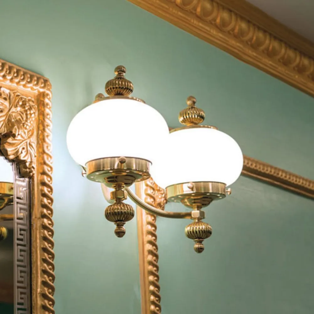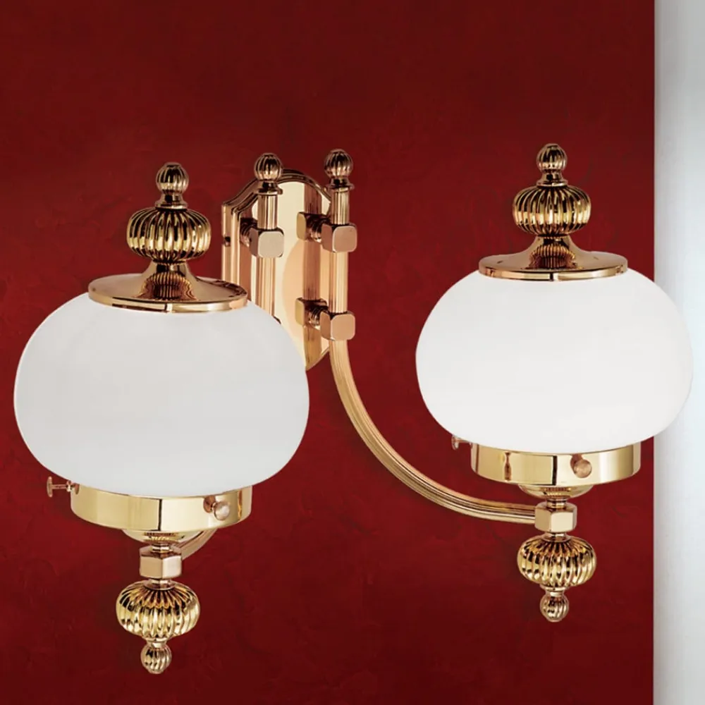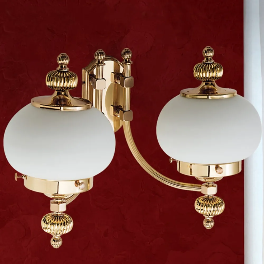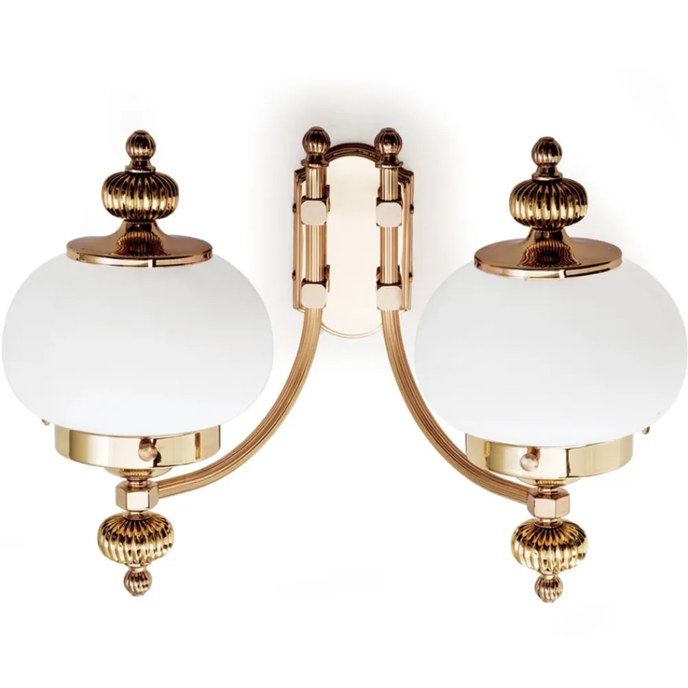 Væglampen giver et meget eksklusivt indtryk. Den forener poleret messing med to runde matte opalglas. DELIA er et garanteret blikfang i stuen med sit flotte design.
