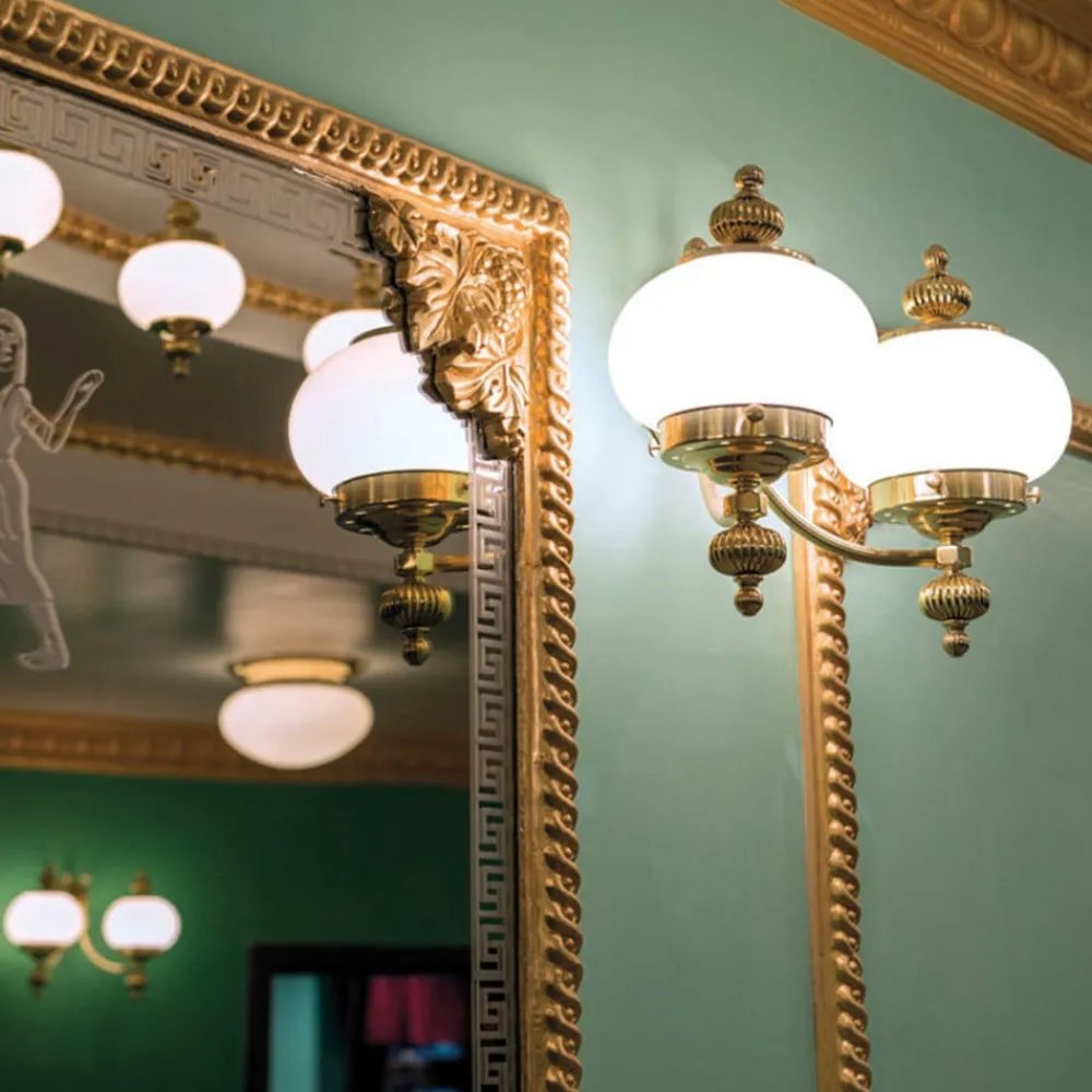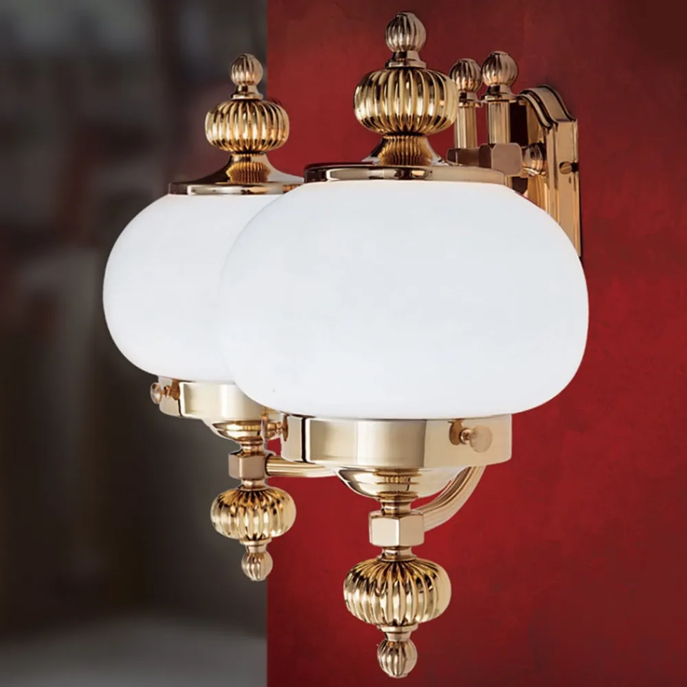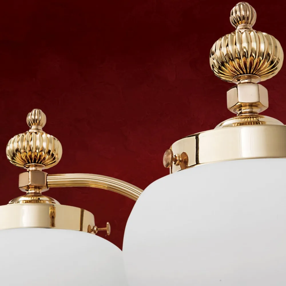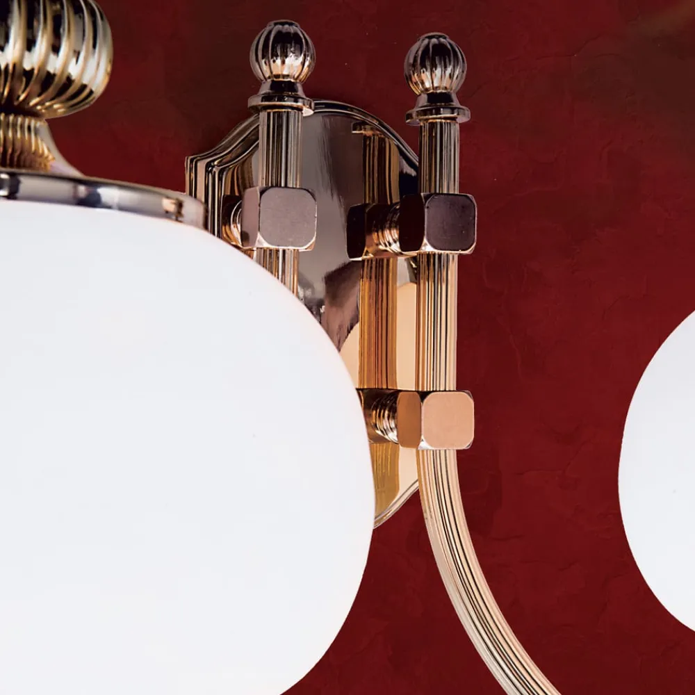 Væglampen giver et meget eksklusivt indtryk. Den forener poleret messing med to runde matte opalglas. DELIA er et garanteret blikfang i stuen med sit flotte design.