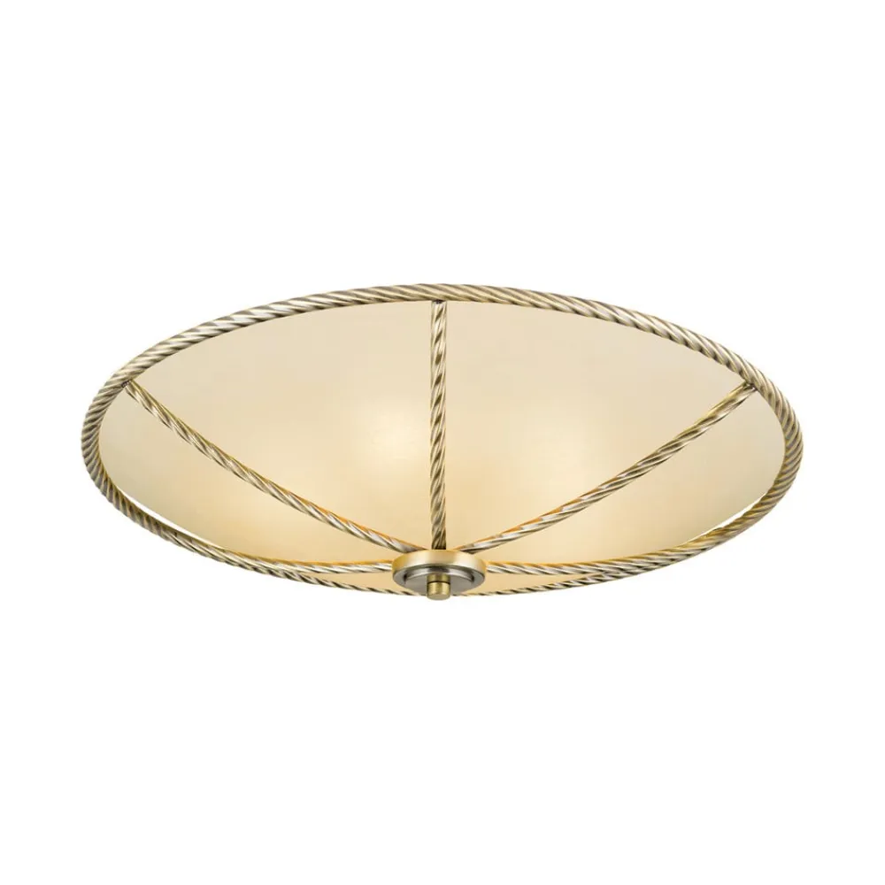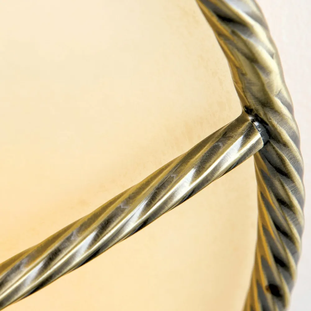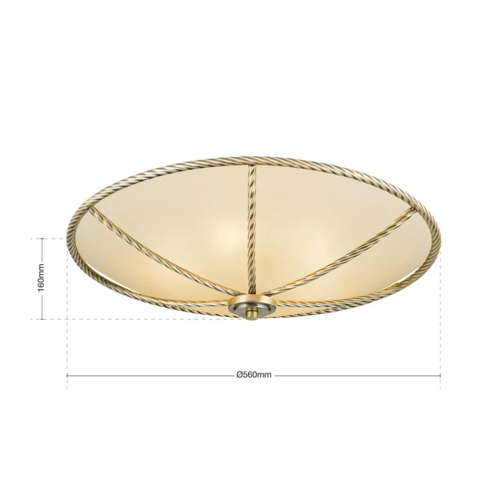 Smuk belysning i klassisk stil: Galina-loftslampen overbeviser med cremefarvet glas og metalelementer i gammel messingDen, der leder efter den rigtige belysning til en klassisk indrettet stue, vil helt sikkert kunne lide Galina-loftslampen. Lyset her skinner i en særlig varm tone, fordi den matte glasskærm ikke bare er hvid, men i en tiltalende cremefarvet nuance. En anden bemærkelsesværdig detalje er metalrammen og metalkanterne, fordi overfladestrukturen her ikke er glat, som man kunne forvente, men imiterer strukturen i et snoet reb.