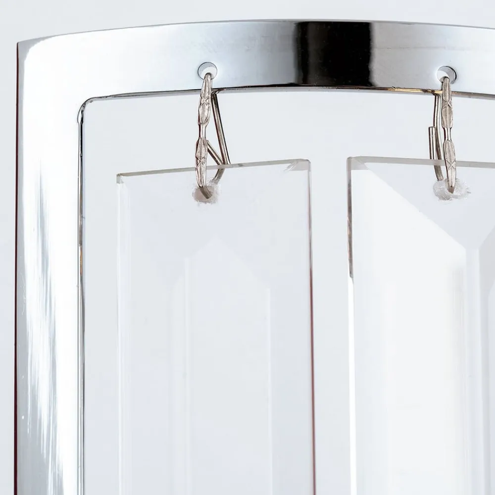 Når belysningen er tændt, brydes lyset, der udsendes af det anvendte lysstof, sig selv i krystallerne og reflekteres vidunderligt. Den smukke glans forstærkes af det forkromede metal.