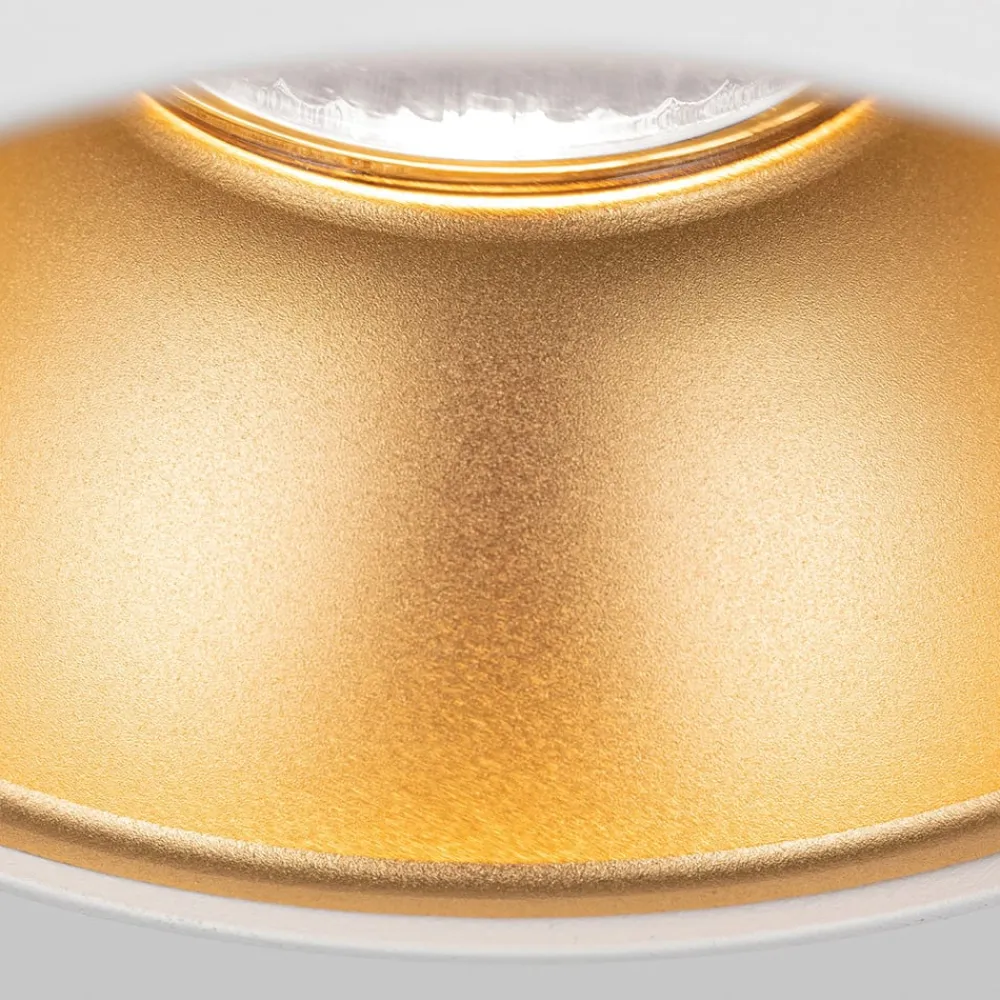 Starlight loftspot med udskiftelig indvendig reflektor Den runde loftspot er velegnet som en enkeltstående enhed til accentbelysning eller placeret i grupper til generel belysning eller områdebelysning i stuer og korridorer. Der kræves en pære på maks. 50 watt med GU10-sokkel, som ikke er inkluderet i leveringsomfanget. En passende pære kan bestilles separat under tilbehør. Starligth er udstyret med en indvendig reflektor i samme farve som huset. Leveringen omfatter også en guldfarvet udskiftelig reflektor, som giver det udsendte lys en varm glød – eksternt dæmpbar