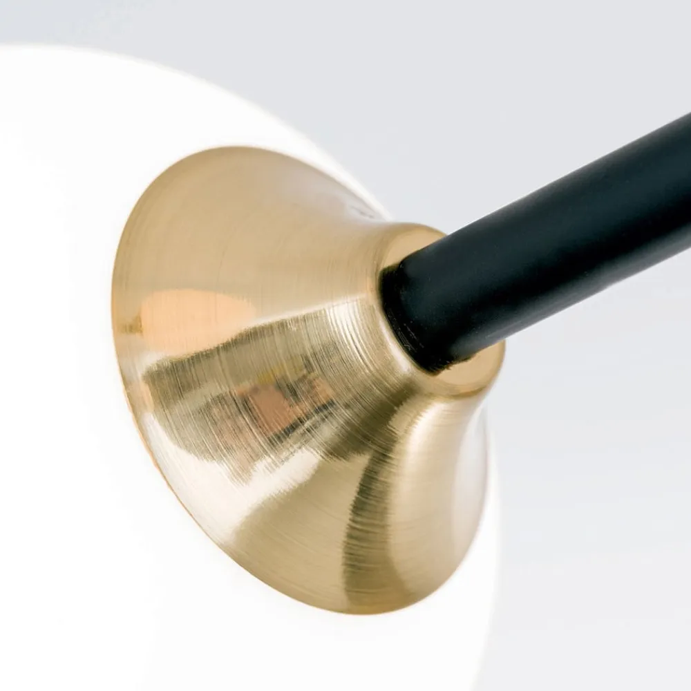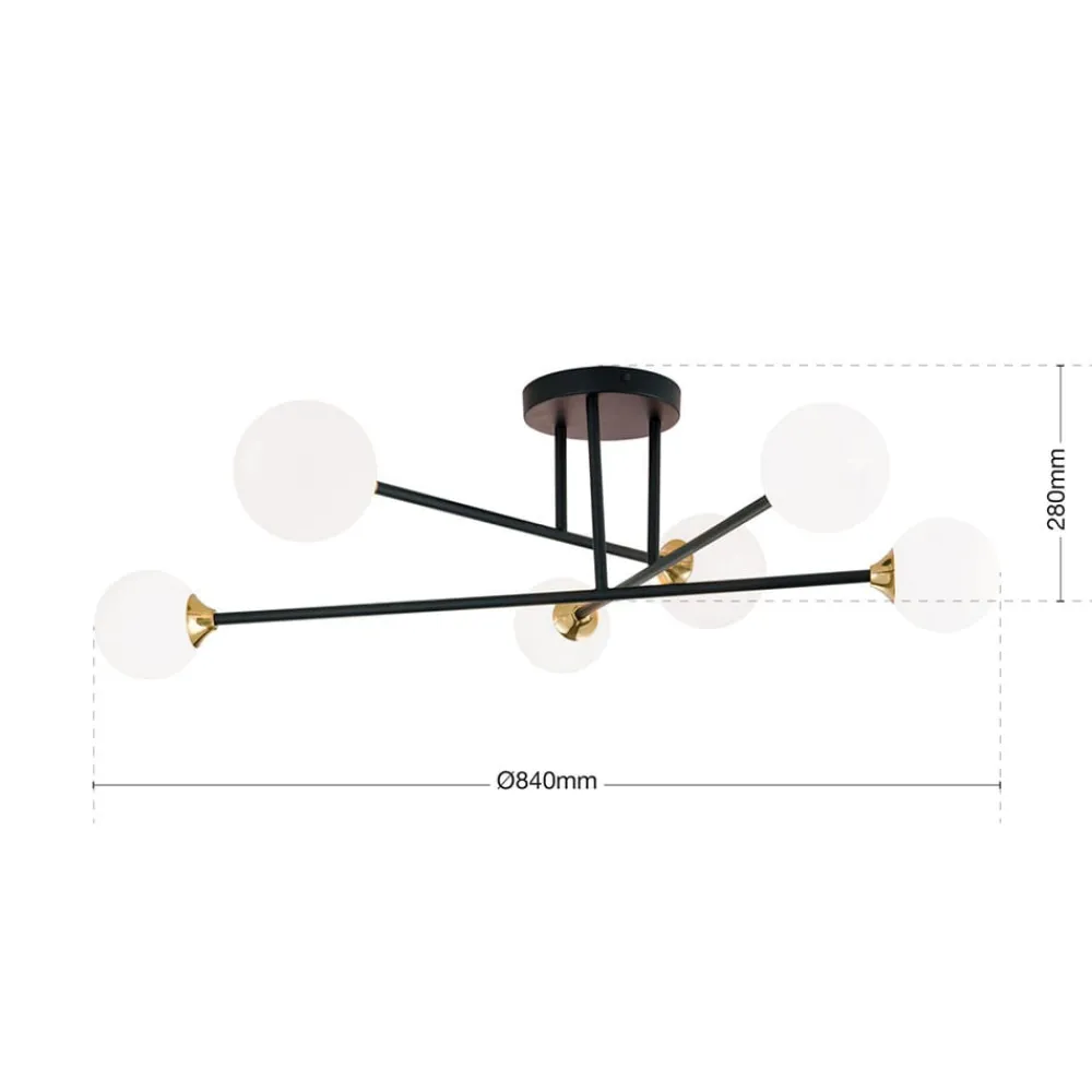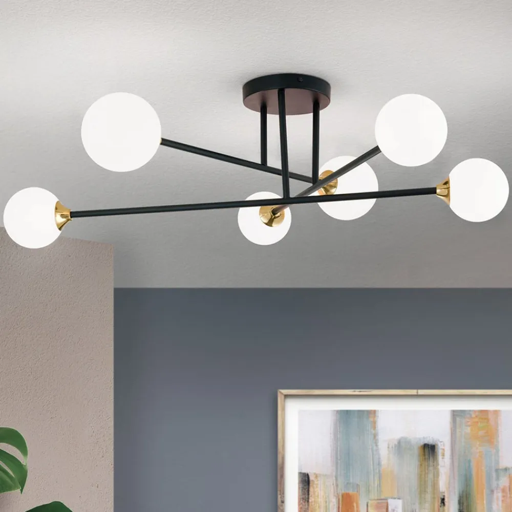 Denne loftslampe kaldes Snowwhite på grund af de seks opalhvide glasskærme i form af en kugle. Disse er placeret i de ydre ender af de tre krydsende metalstænger. Den ret store loftslampe er derfor særligt velegnet til større rum – både i stuen og i soveværelset. Det opalhvide glas gør det muligt for lyset at stråle uden at blænde og meget jævnt i alle retninger. Ved hjælp af dæmpbare pærer og en eksisterende lysdæmper er det også muligt at dæmpe lyset. Pærer er ikke inkluderet i leveringsomfanget.