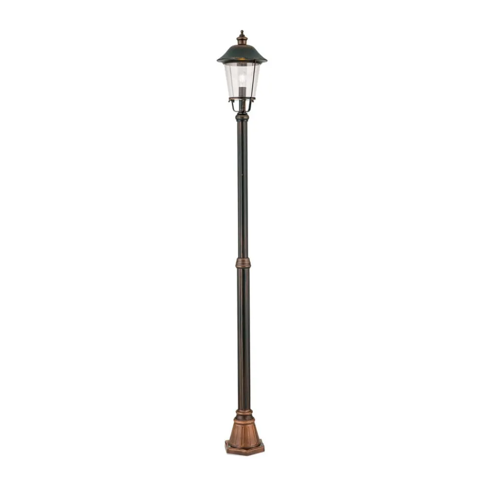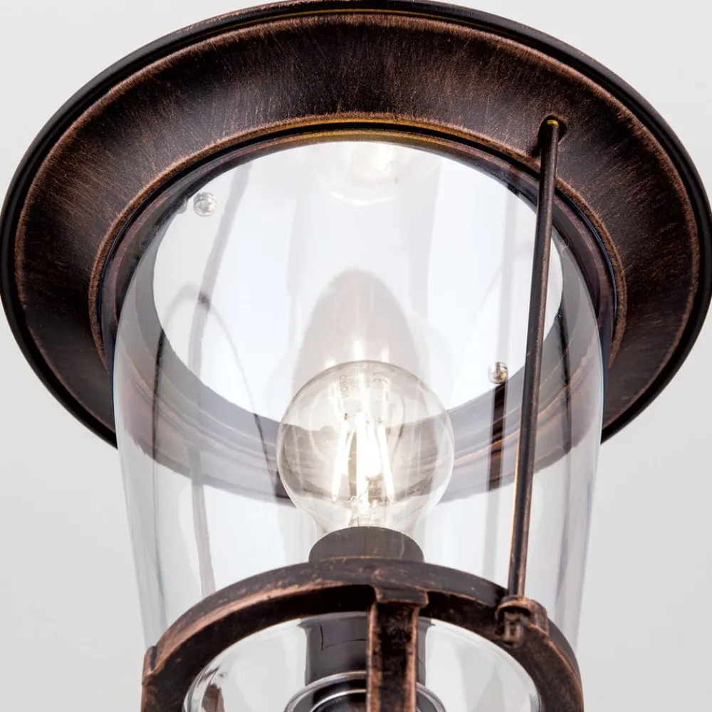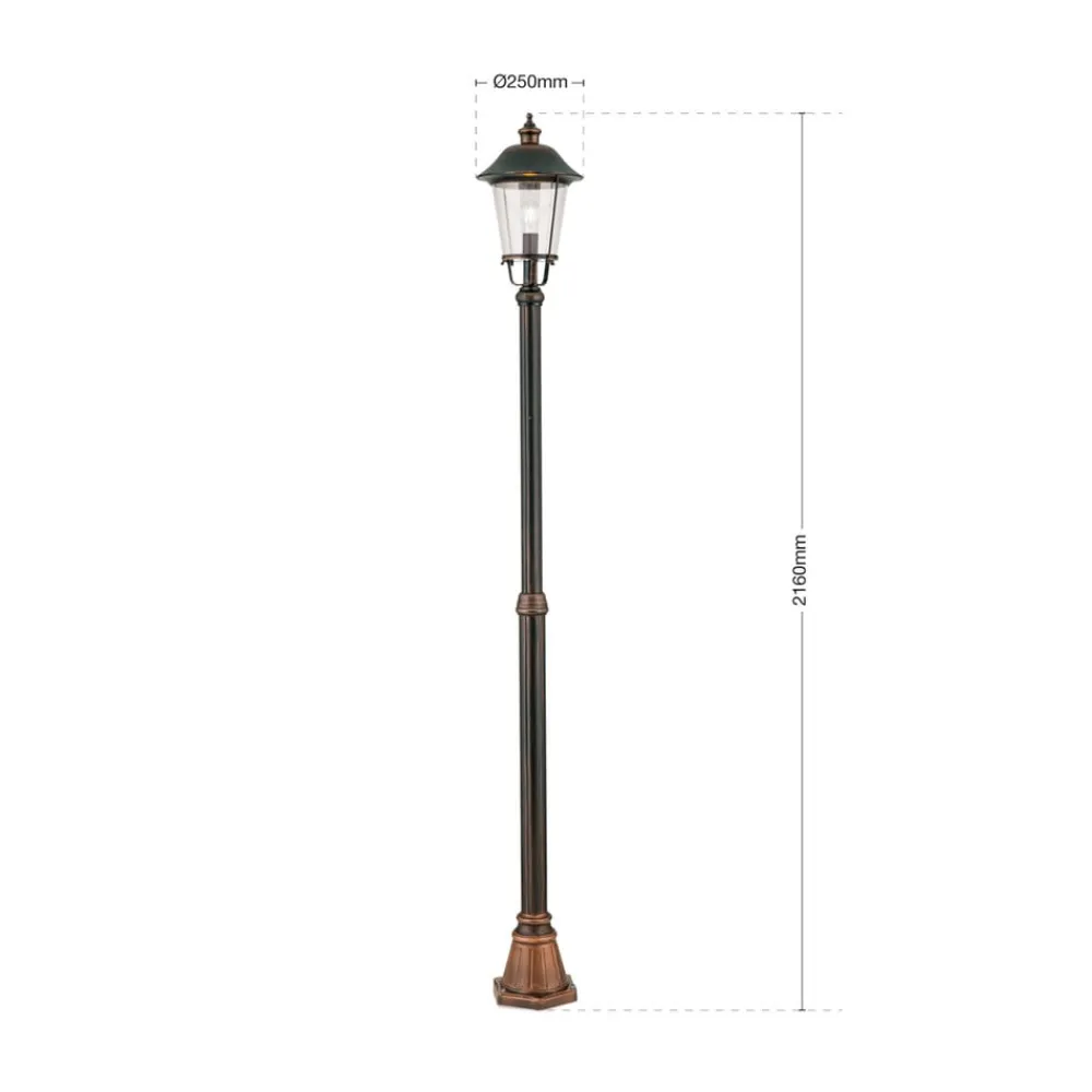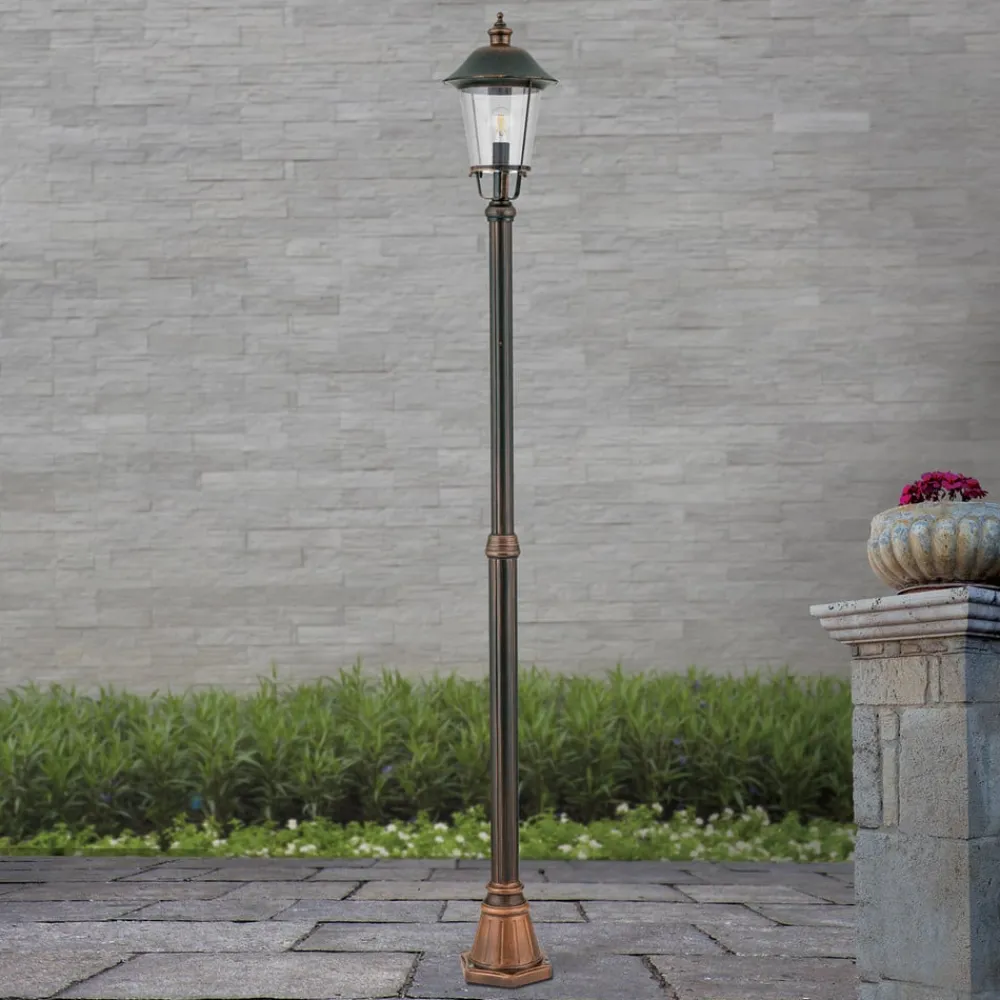 Lampemaste MARIELLAs skærm giver den en charmerende og nostalgisk udstråling. Den ligner en klassisk lygte med en sort og kobberfarvet overflade. Gadelampen passer blandt andet godt i indkørsler eller langs veje eller stier i haven, og skaber en god atmosfære.