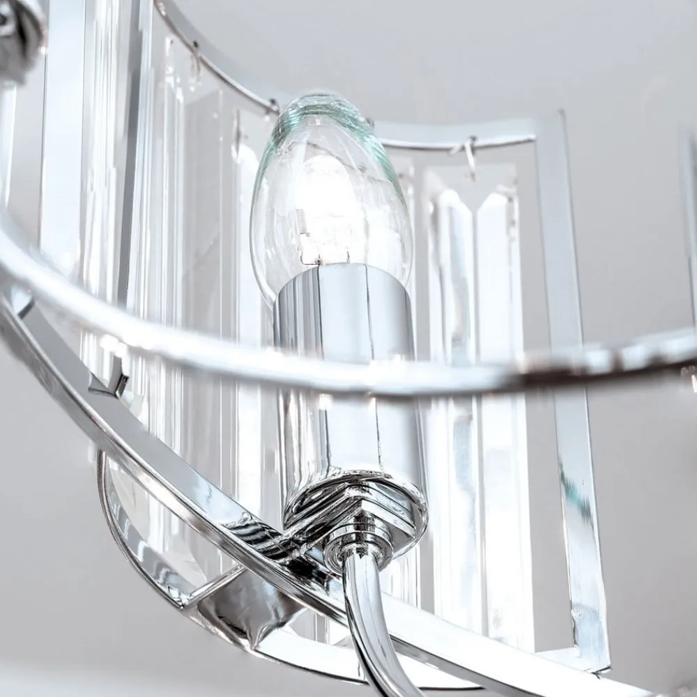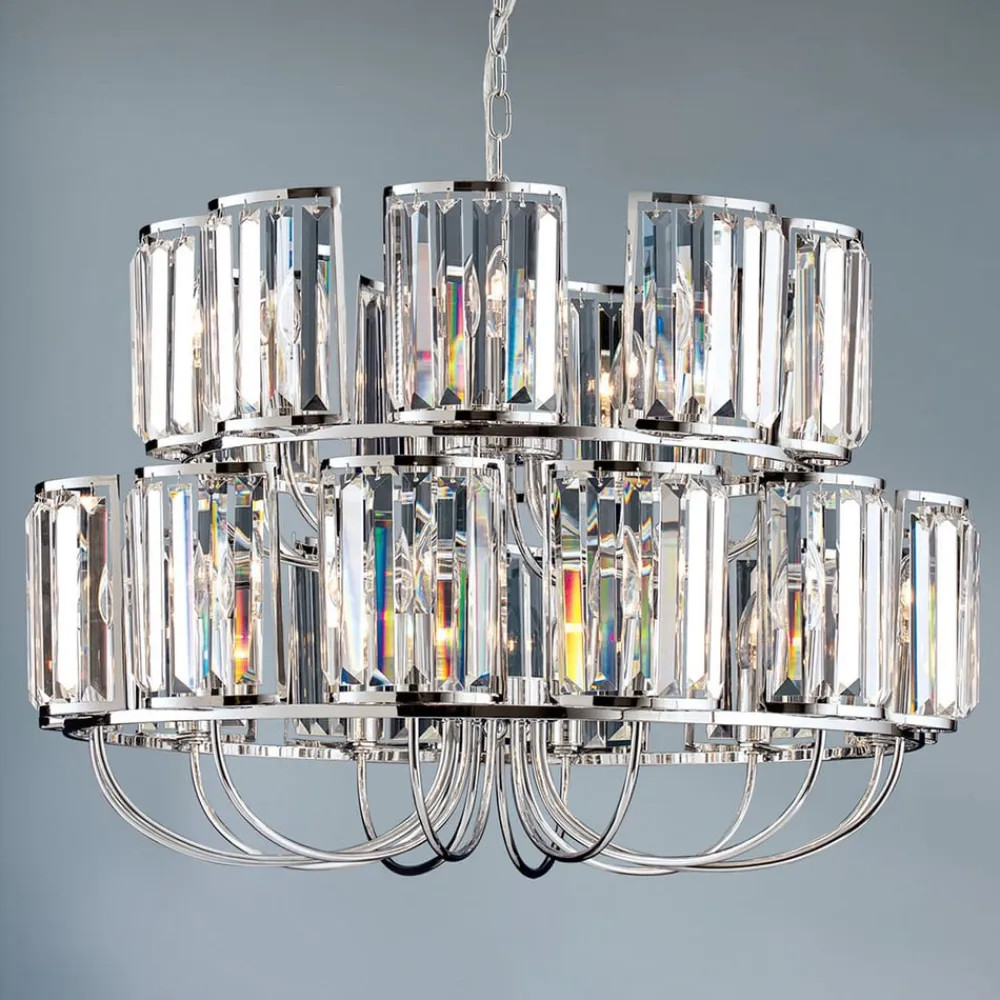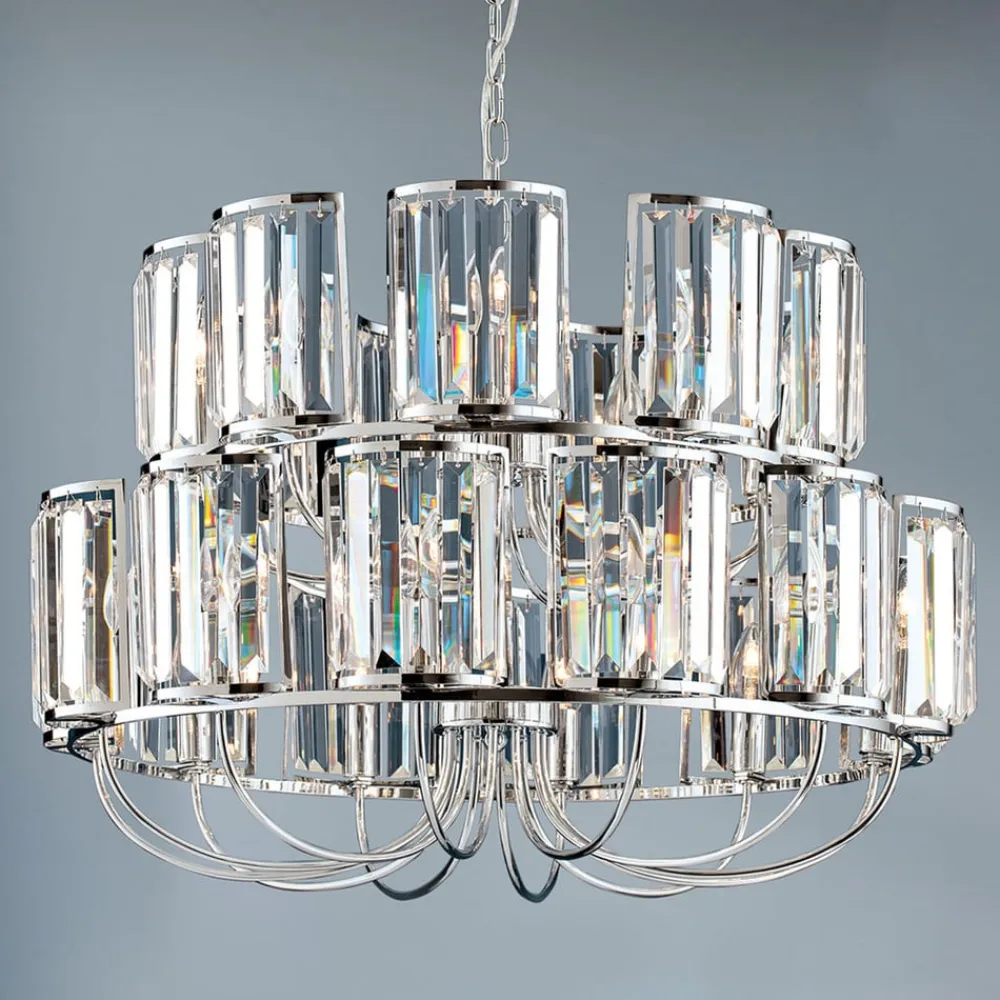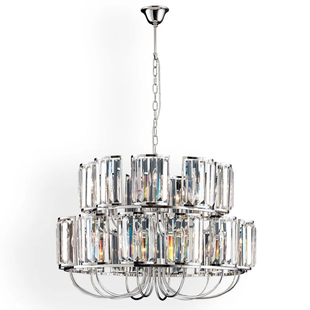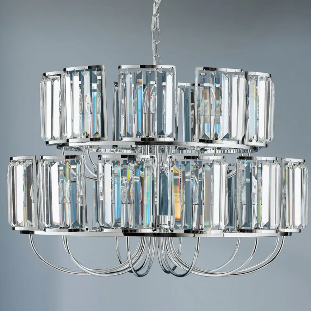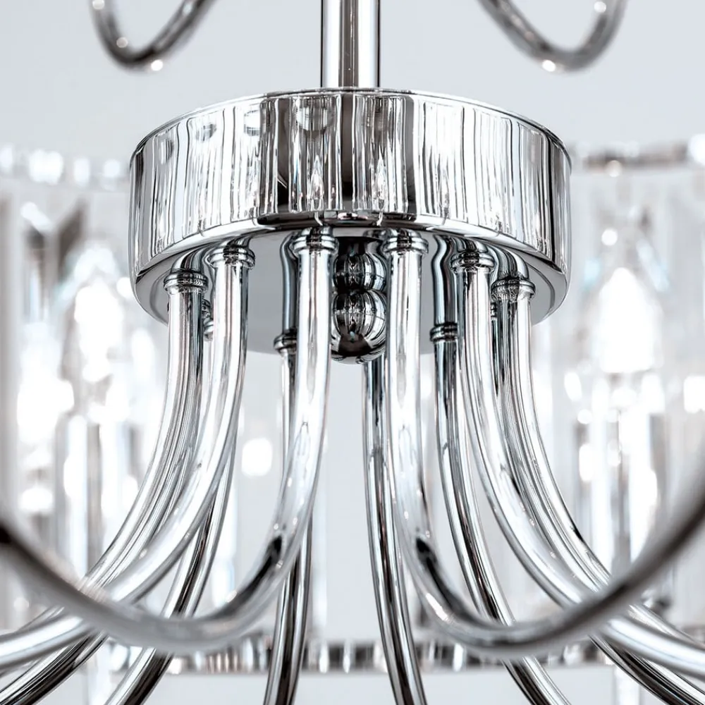 Lysekronen Gstaad har i alt 21 lyskilder i to niveauer, der perfekt fremhæver de mange K9-krystaller. Lysekronens metalelementer er skinnende forkromet, hvilket forstærker effekten.