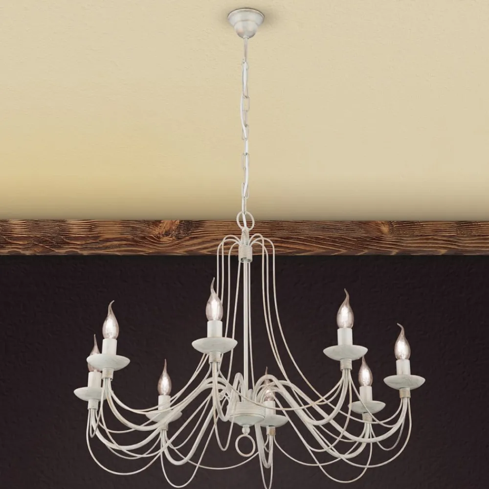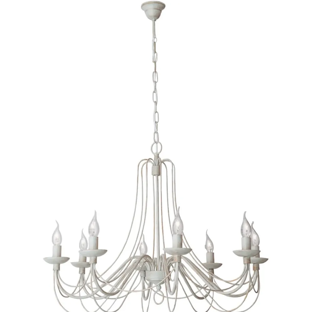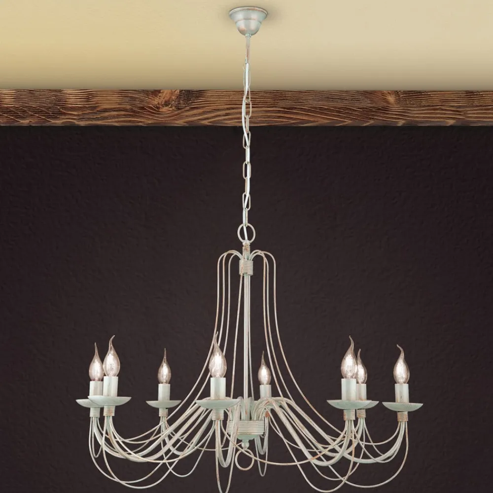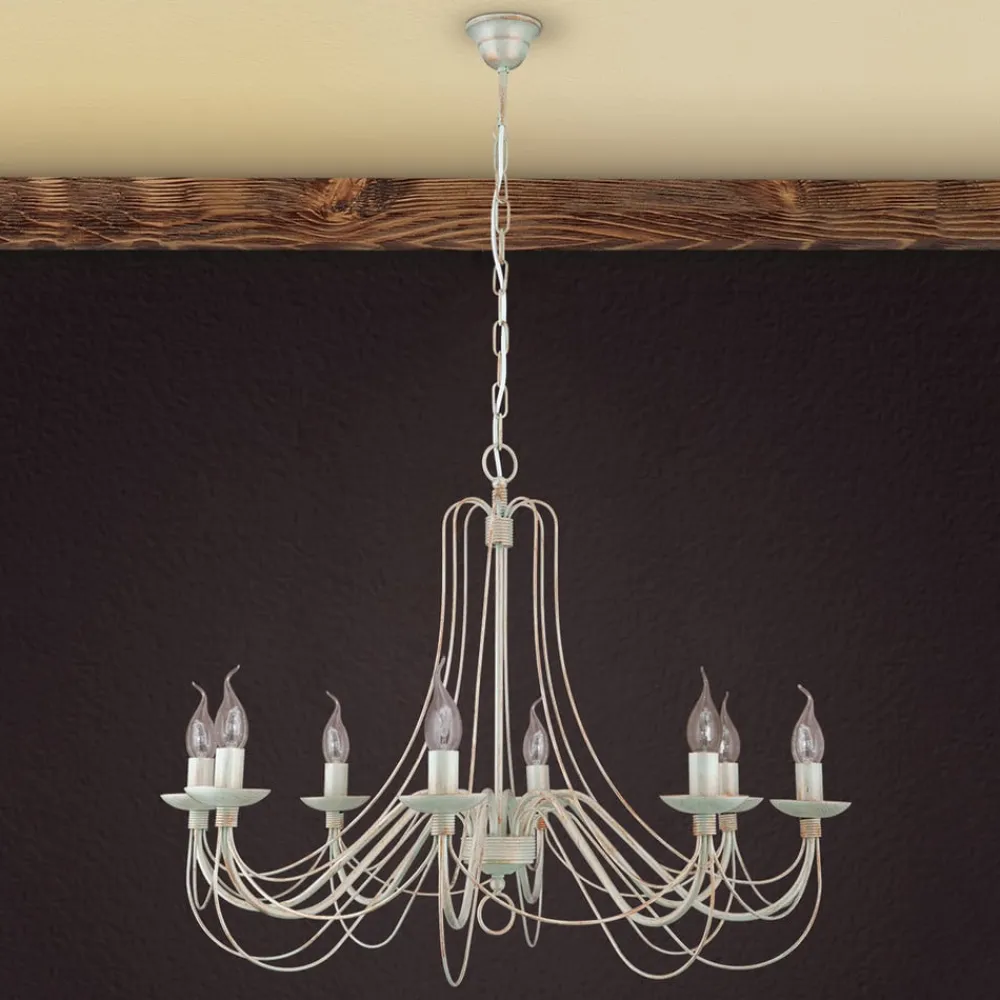 Med bløde former fascinerer metalstellet med sine mange dele på lysekronen med 8 lyskilder Antonina, som grundet farvevalget – en sært elfenbenstone – virker meget romantisk, hvilket gør denne lyskilde særdeles velegnet fx. i landhusstilen. Otte kertepærer (E14-fatning) tilfører rummet en festlig glans med deres behagelige lys. Lysekronen Antonina er udstyret med et rustikt kædeophæng i samme farvetoner. Pærerne medfølger ikke ved levering, men skal bestilles separat under Tilbehør.
