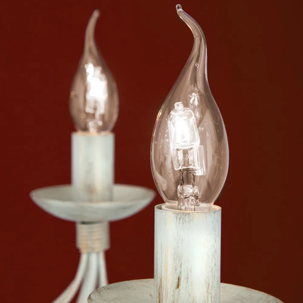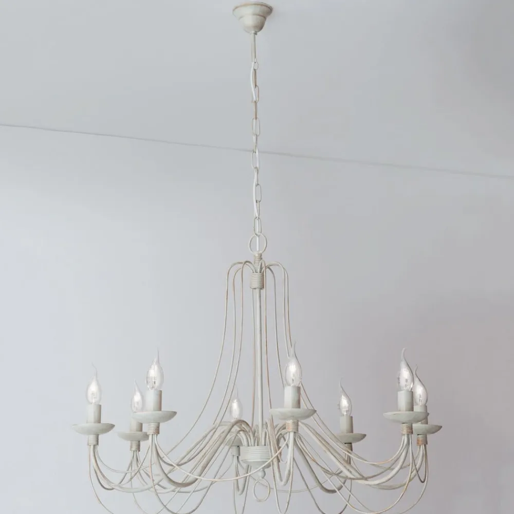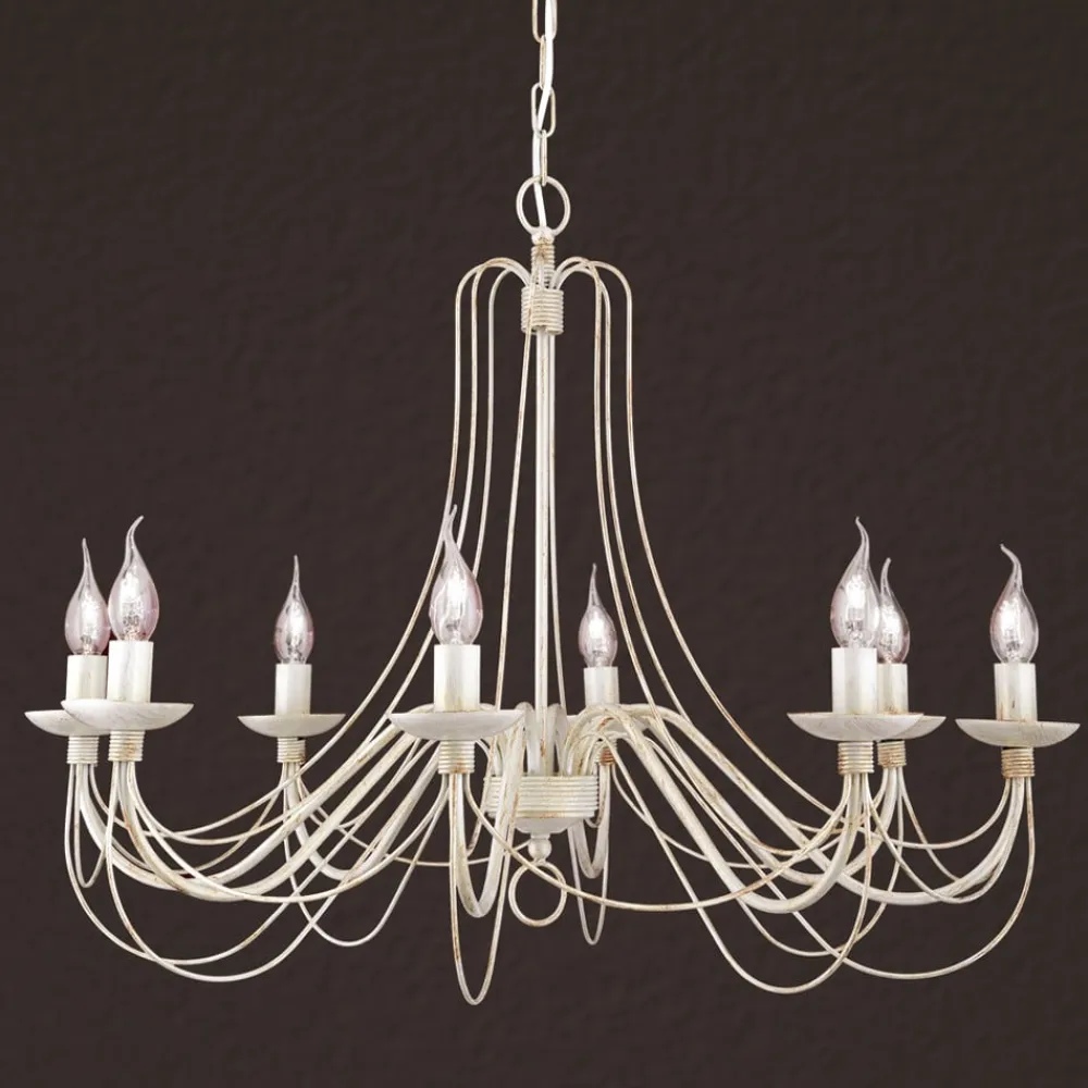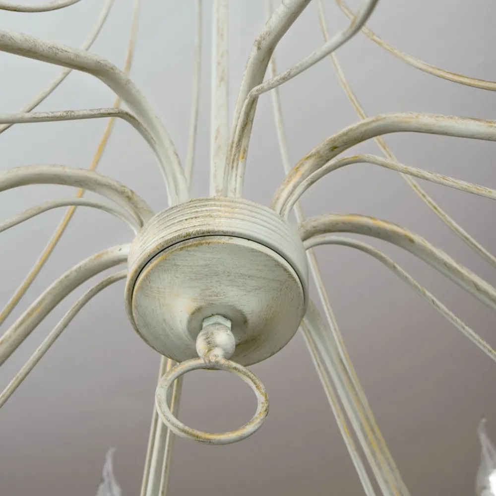Med bløde former fascinerer metalstellet med sine mange dele på lysekronen med 8 lyskilder Antonina, som grundet farvevalget – en sært elfenbenstone – virker meget romantisk, hvilket gør denne lyskilde særdeles velegnet fx. i landhusstilen. Otte kertepærer (E14-fatning) tilfører rummet en festlig glans med deres behagelige lys. Lysekronen Antonina er udstyret med et rustikt kædeophæng i samme farvetoner. Pærerne medfølger ikke ved levering, men skal bestilles separat under Tilbehør.