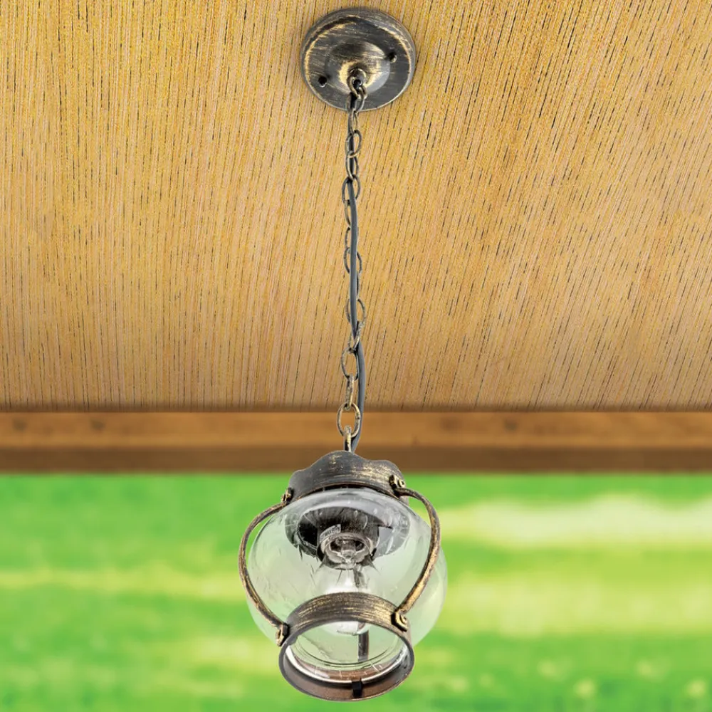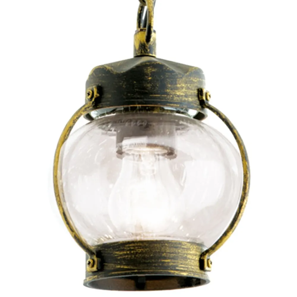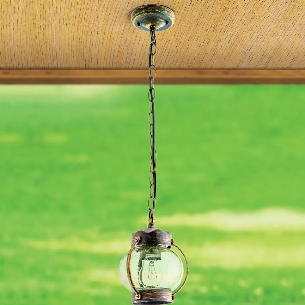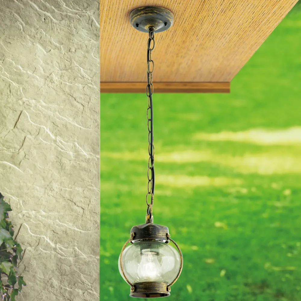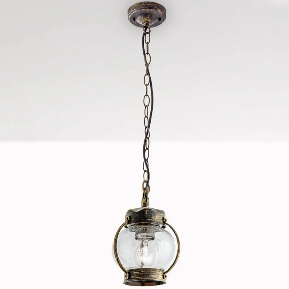 Denne smukke hængelampes rustikke kædeophæng kan ved montage tilpasses så det har den ønskede længde. Den runde skærm af klart bobleglas får lyset til at stråle klart og alligevel blødt. Kombinationen af fint mønstret glas og metalstellets sort-gyldne farve ser meget dekorativt ud og pynter på ethvert grundstykke.