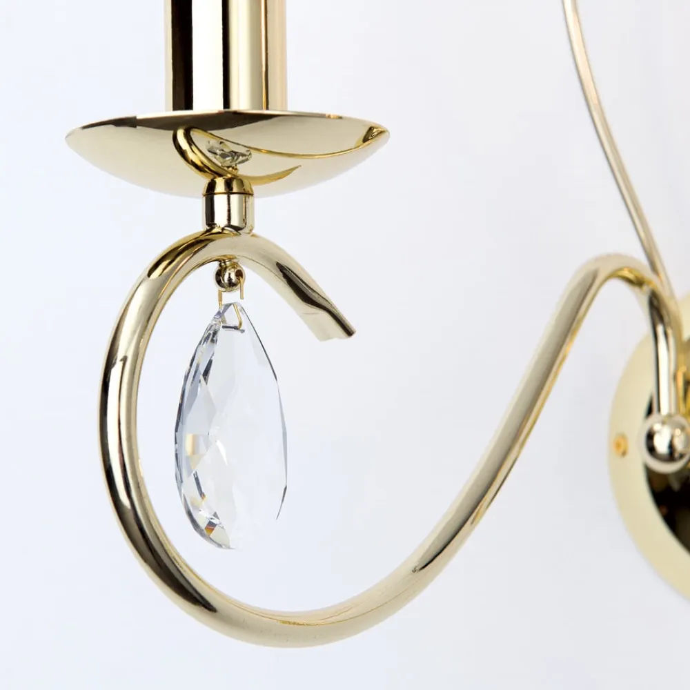 To filigrane lampearme, formskønne dekorative elementer og den lille halvkugleformede vægbeslag udgør tilsammen en tiltalende og elegant væglampe med fine kandelaberfatninger. Den ædle pragt prydes af en forgyldt overflade og funklende blykrystaller fra Asfour. Alessia giver stuen en fortryllende atmosfære.