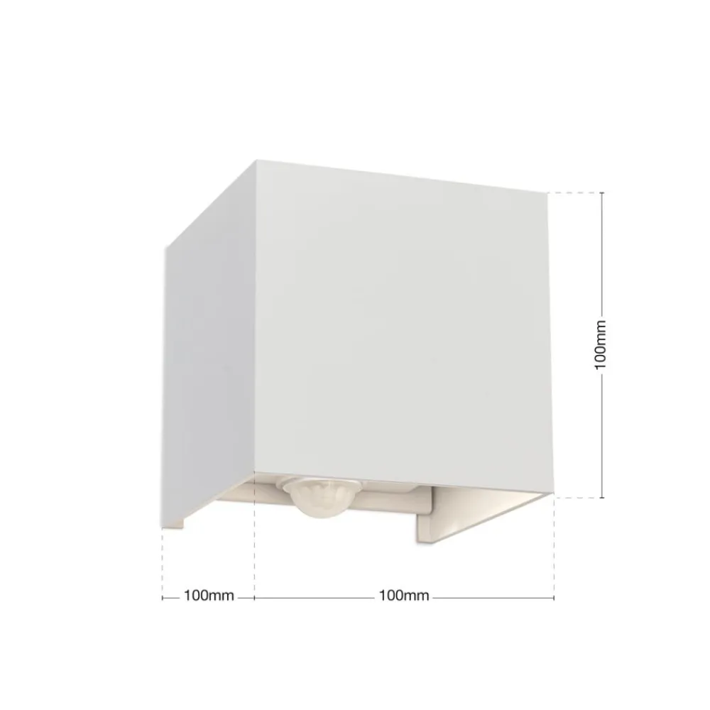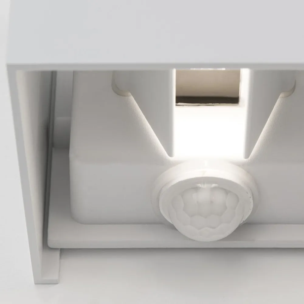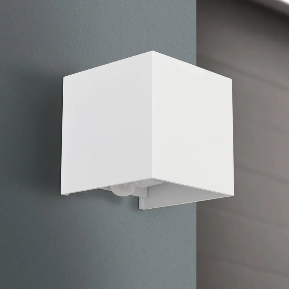 Udendørs væglampe Cube-S, hvid, metal, bevægelsessensor