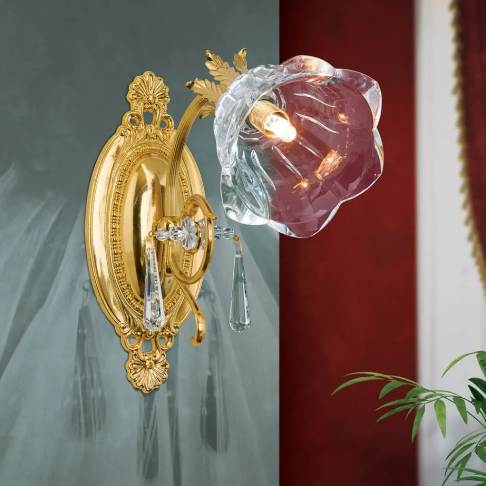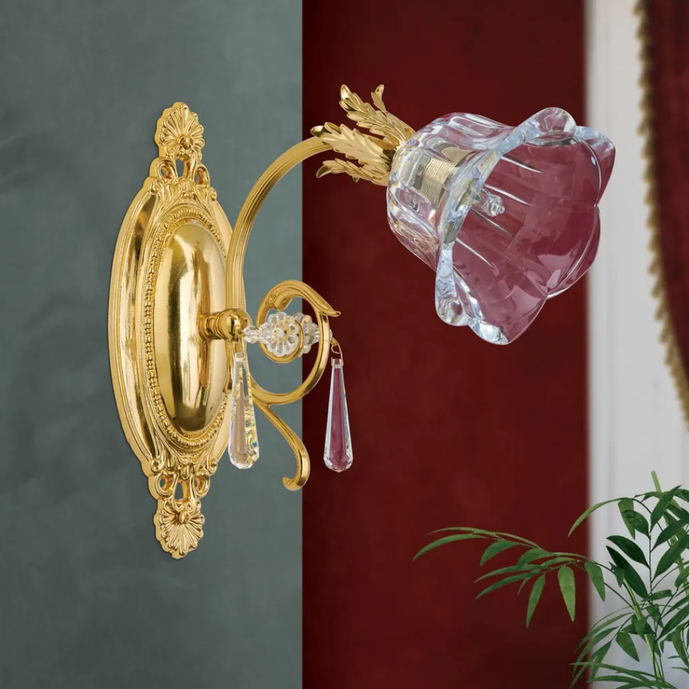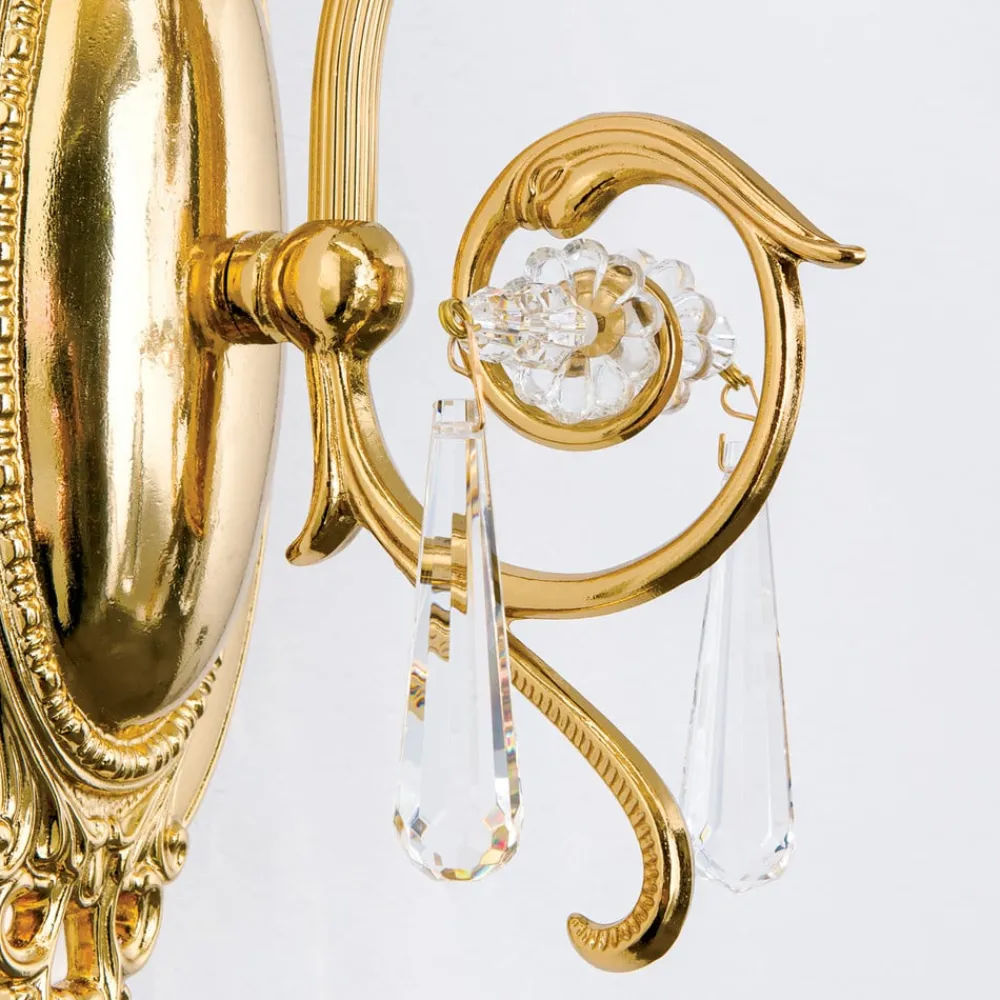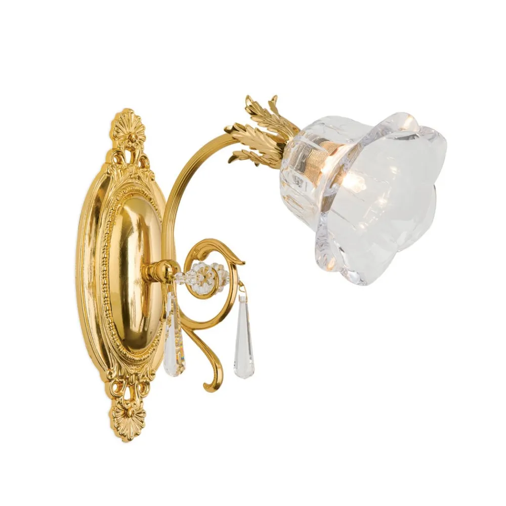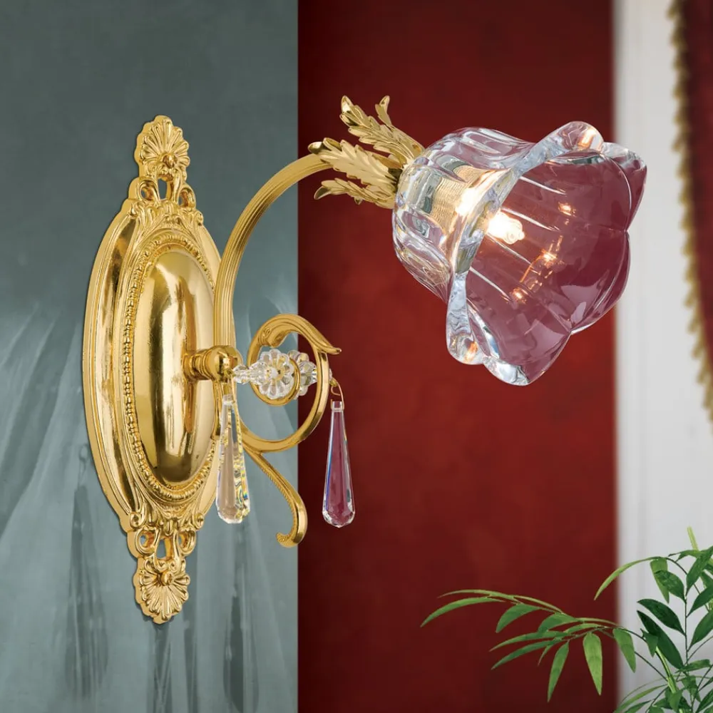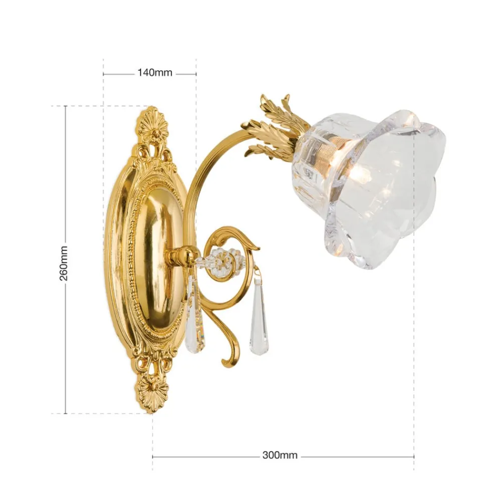 Væglampe La Boheme forener luksuriøse materialer og tidløs æstetik. Fremstillet af massivt messing og i guldlook, sætter den et stilfuldt præg på ethvert rum. De funklende krystalglaselementer i 1A fuldslebet krystal skaber et fascinerende lysspil, der giver rummet en unik atmosfære. Kombinationen af gyldne og klare elementer understreger den elegante florentinske stil og gør lampen til et blikfang i stue- og spiseområder.