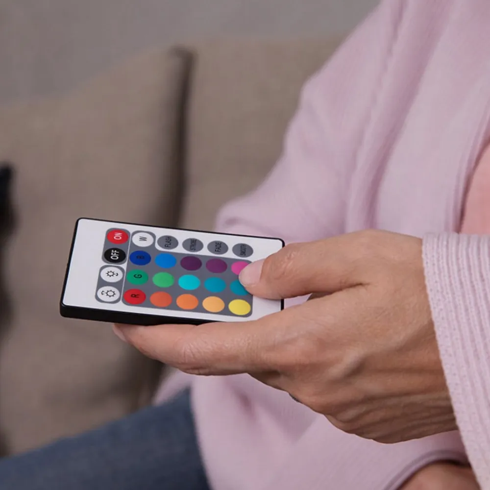 E27 LED-lampe 9,4W med fjernbetjening – farvet og hvidt lys Fleksibilitet i belysningen er garanteret med denne E27 LED-lampe. Udover varmt hvidt lys tilbyder lampen farvet belysning, og farvernes mætning samt lysets intensitet kan justeres. Lysindstillingerne kan nemt justeres via den medfølgende fjernbetjening. Fjernbetjeningen indeholder også fire forudindstillede lysscenarier, såkaldte farvesløjfer, som kan vælges ved blot at trykke på en knap. Tekniske data / funktioner: – intuitiv infrarød fjernbetjening medfølger – skiftbar lysfarve varm hvid (2.700 K) eller farvet lys – fire forudindstillede dynamiske effekter: Flash, Strobe, Smooth og Mode – dæmpbar i fire trin – sammenligningsværdi glødelampe 60 W