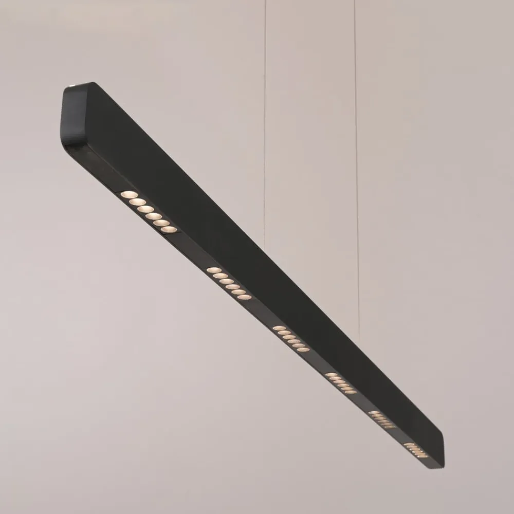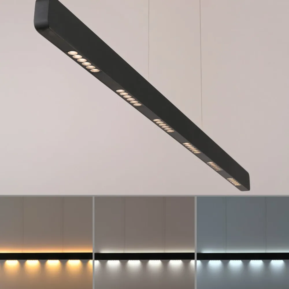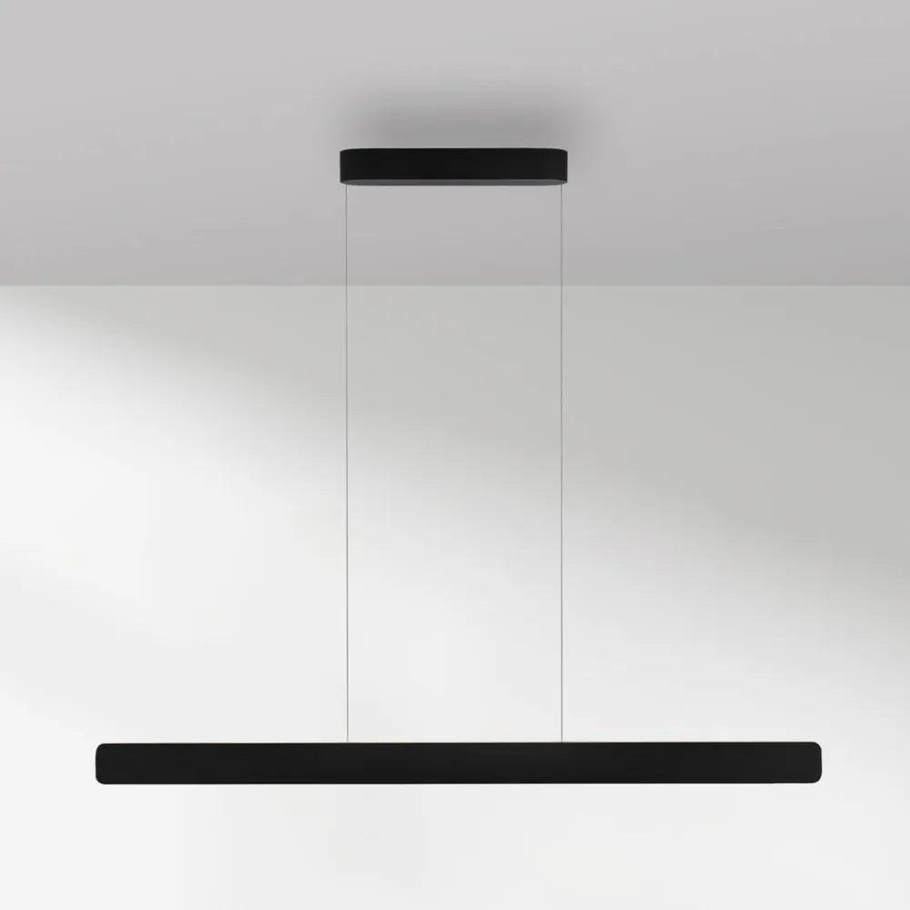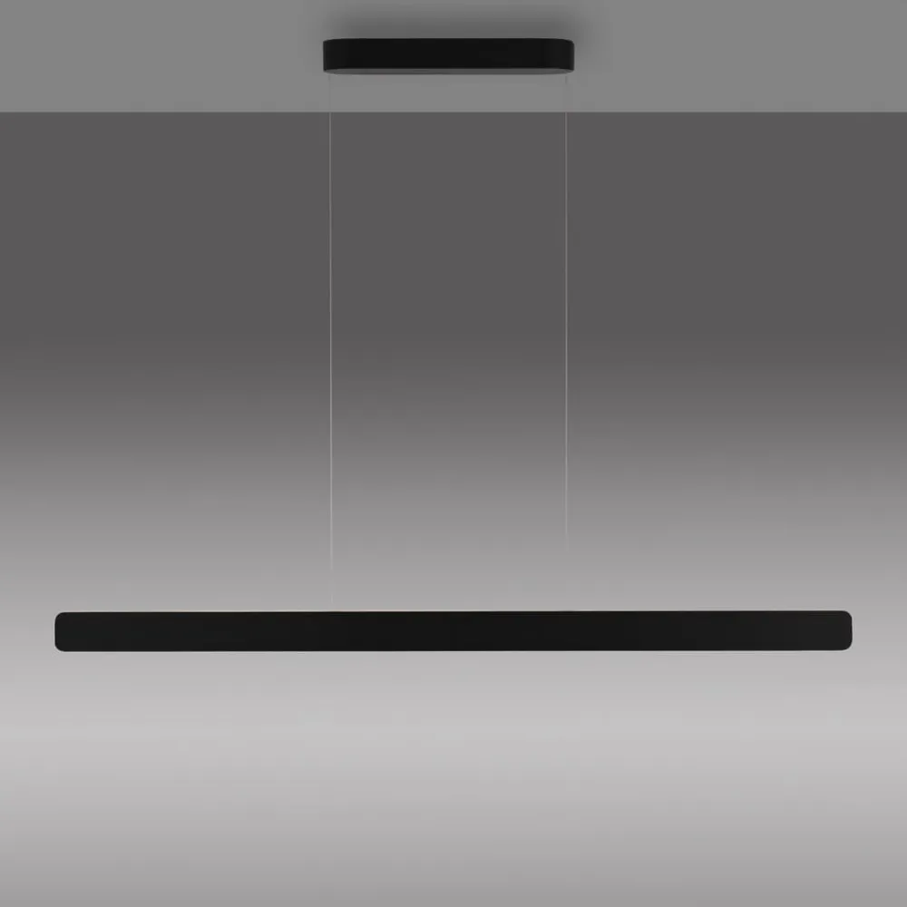Langstrakt LED-hængelampe Q-Stretto af jern med CCT-funktion og Comfort Lift Den er fremstillet af jern og plast og har en langstrakt form. Takket være Comfort Lift-funktionen kan højden justeres når som helst, hvilket gør den perfekt til brug over et spisebord. Dens fastmonterede LED’er har en justerbar lysfarve (CCT) og en dæmpningsfunktion, hvorved lysstyrken og lysfarven (2.200 K – 5.000 K) kan justeres fleksibelt. Begge funktioner styres nemt via den medfølgende fjernbetjening.