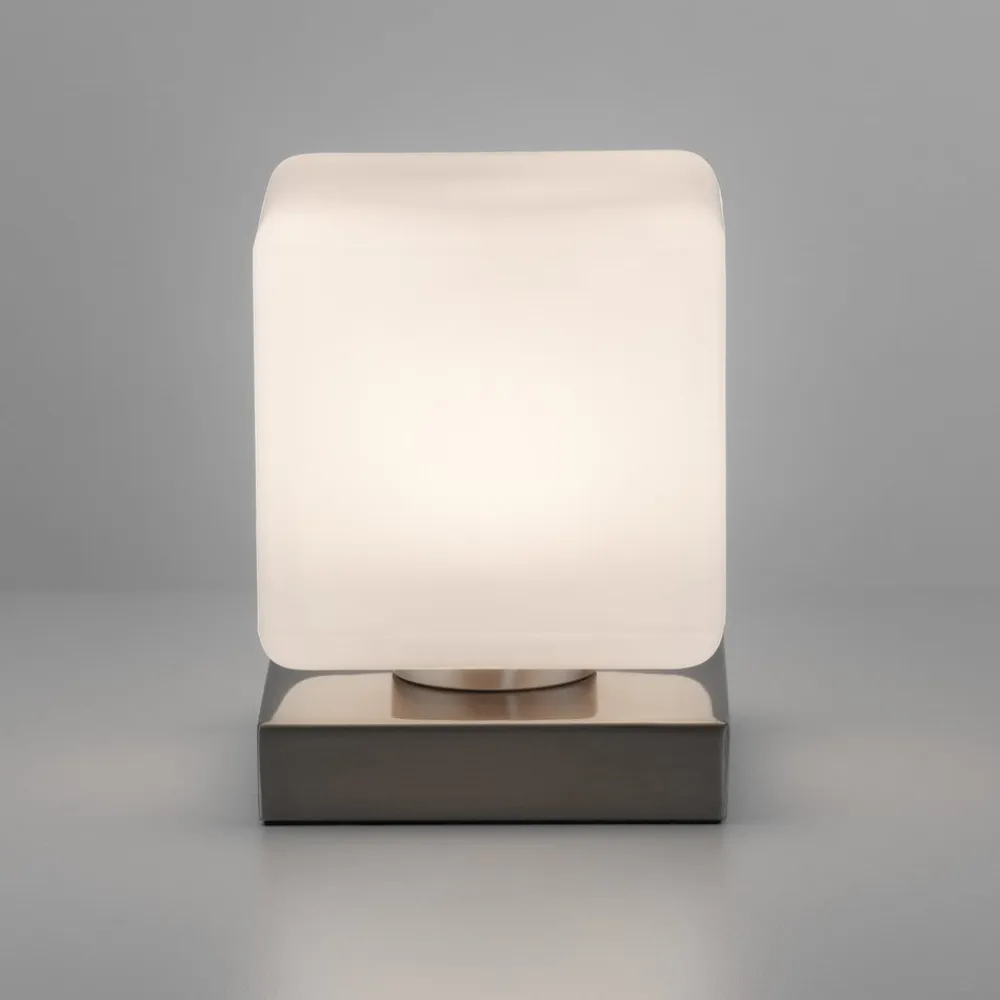Dadoa LED-bordlampe af glas med touchdæmper Dadoa LED-bordlampen har et diskret, tidløst design. Lampeskærmen ligner en terning, der er monteret på en firkantet lampefod. Lampens varmhvide lys skaber en behagelig atmosfære i rummet. Den integrerede berøringsdæmper gør det muligt at dæmpe bordlampen til tre niveauer (10%-50%-100%). Takket være dens diskrete udseende kan den integreres i alle slags indretningsstile.
