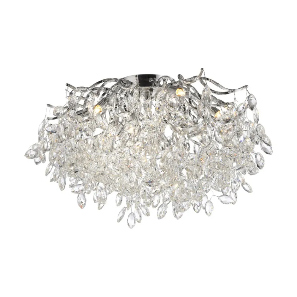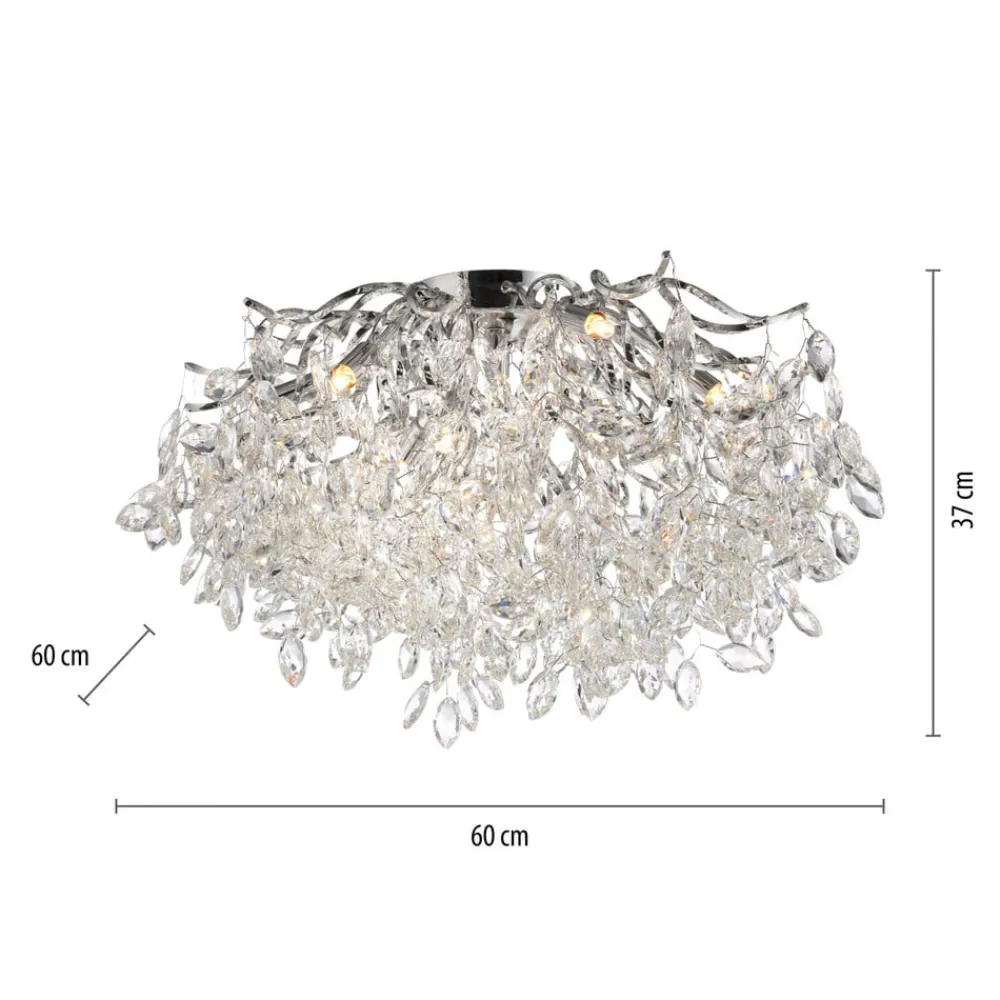 Ricicle loftslampe af forkromet metal med krystalophæng Ricicle loftslampen ser luksuriøs og elegant ud i ethvert rum, uanset om det er stuen, entréen, hotellobbyen, restauranten eller hallen. Det elegante, store armatur af skinnende forkromet metal er udstyret med utallige kæder af funklende krystalvedhæng og skaber et betagende lysspil, som vil fortrylle ethvert rum. Dens pompøse tilstedeværelse og eksklusive udstråling gør lampen til et elegant blikfang i ethvert rum. Loftslampen er udstyret med G9-fatninger, som kan bruges med både LED-lamper og halogenlamper for at holde trit med de nyeste standarder for energieffektivitet. Pendlerne i glaskrystal reflekterer lyset på en fascinerende måde og skaber en indbydende og blændende atmosfære.