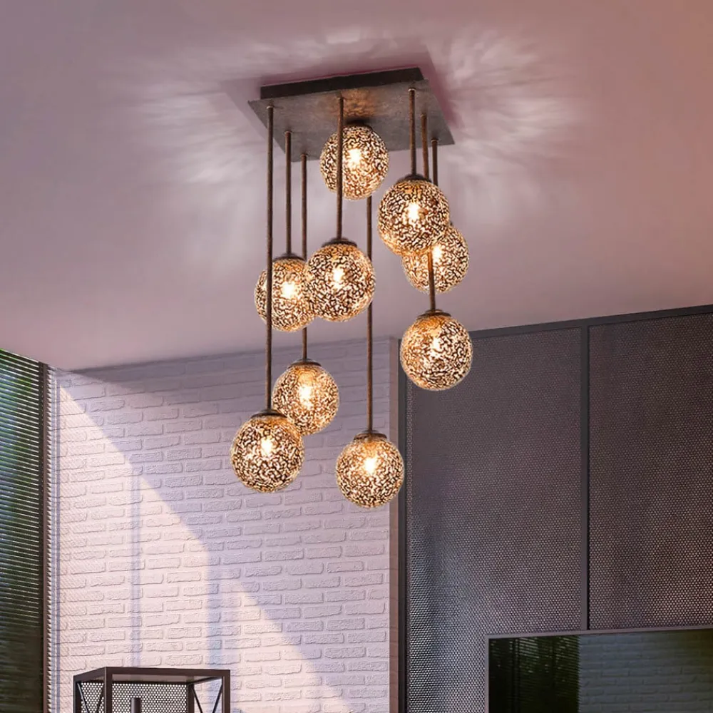 Greta – en loftlampe med 9 lyskilder, der fanger øjet Ni kugleformede skærme af stemplet metal med et smukt mønster og guldfarvet finish er jævnt fordelt og ophængt fra den firkantede baldakin på stive arme i forskellige højder. En skærm er monteret direkte i midten af den rustfarvede baldakin. Lampearmene er også rustfarvede, hvilket skaber en smuk kontrast til skærmene og fremhæver de kugleformede skærme. Loftlampens lyseffekt er også speciel, da skærmene kun er gennemskinnelige på grund af udskæringerne. Greta loftlampen kan også dæmmes med en ekstern lysdæmper (f.eks. drejedæmper på væggen) via husets installation. Dæmpere og pærer er ikke inkluderet i leveringsomfanget.