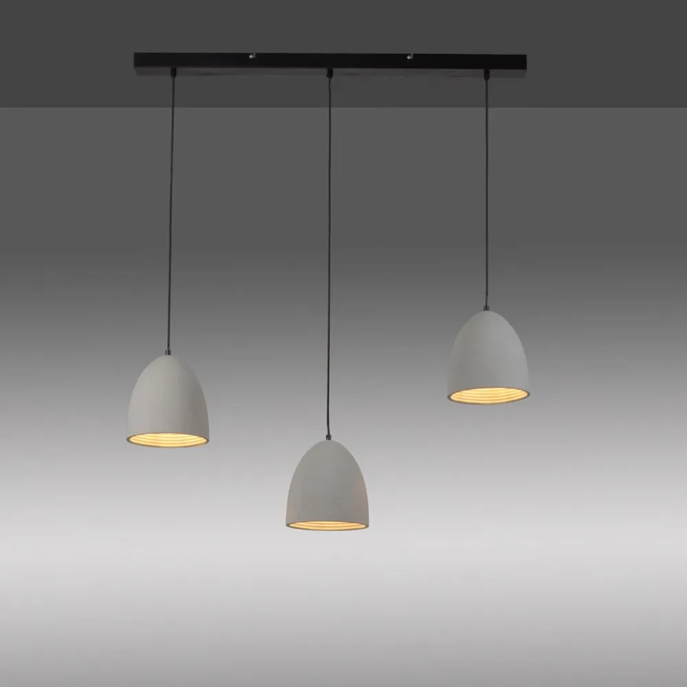 3 lyskilder hængelampe i bjælkeform Eton med lampeskærme i beton De tre lampeskærme på Eton-pendlen er lavet af beton i form af halvovaler. De hænger fra en lang, sortlakeret baldakin og kan monteres i forskellige højder eller ophænges i en linje. Betonmaterialet i kombination med den sorte baldakin og de sorte kabler gør lampen til et perfekt match til et moderne eller industrielt boligmiljø, f.eks. over et aflangt spisebord eller en køkkenbænk.