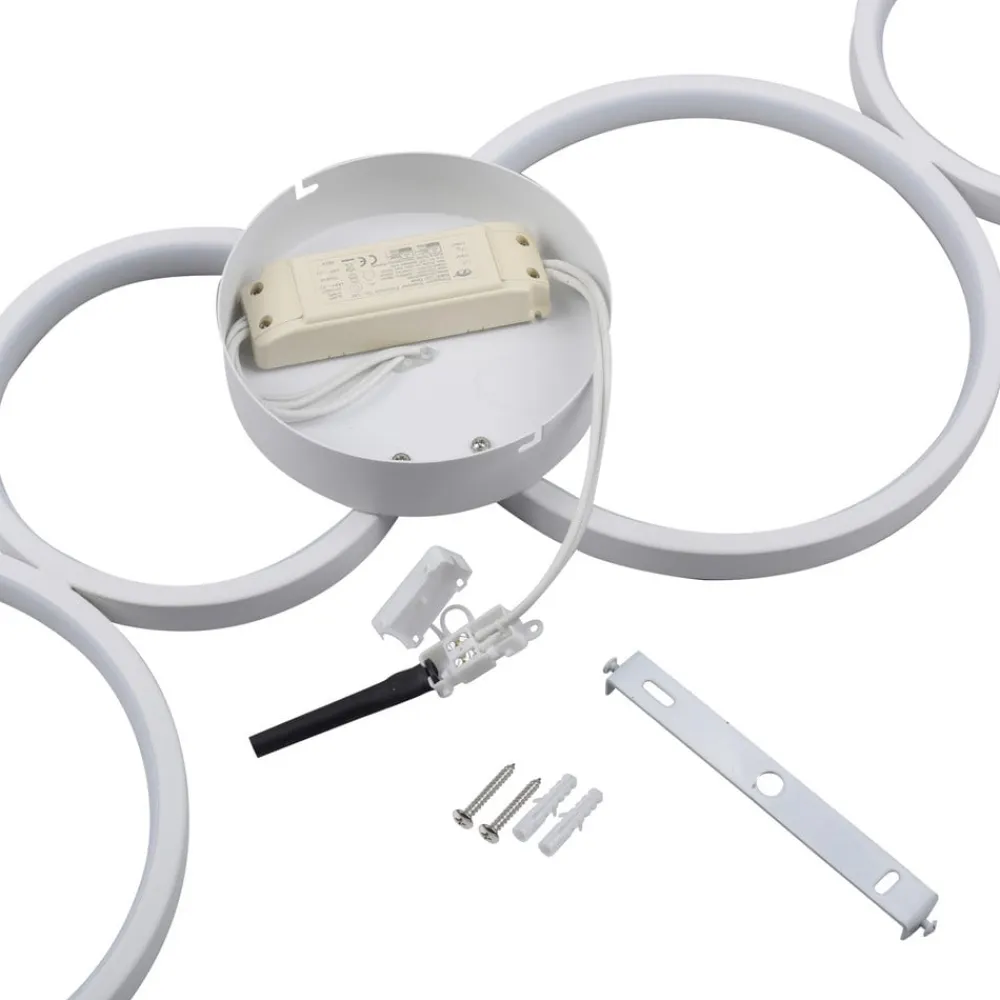 3-trins dæmpbar via vægkontakt: Kiringe LED-loftlampe Den helt hvide Kiringe LED-loftlampe, fremstillet af aluminium og jern, består af fire cirkulære elementer. De integrerede LED’er udsender et kraftigt varmhvidt lys og giver en god almen belysning. Takket være den indbyggede Switchmo-teknologi kan lysets intensitet dæmmes i tre trin ved hjælp af standardvægkontakten.