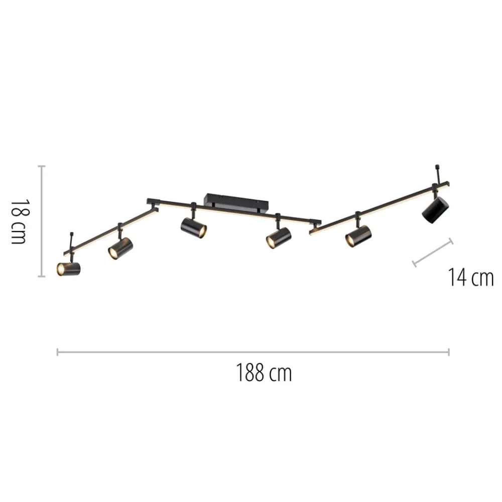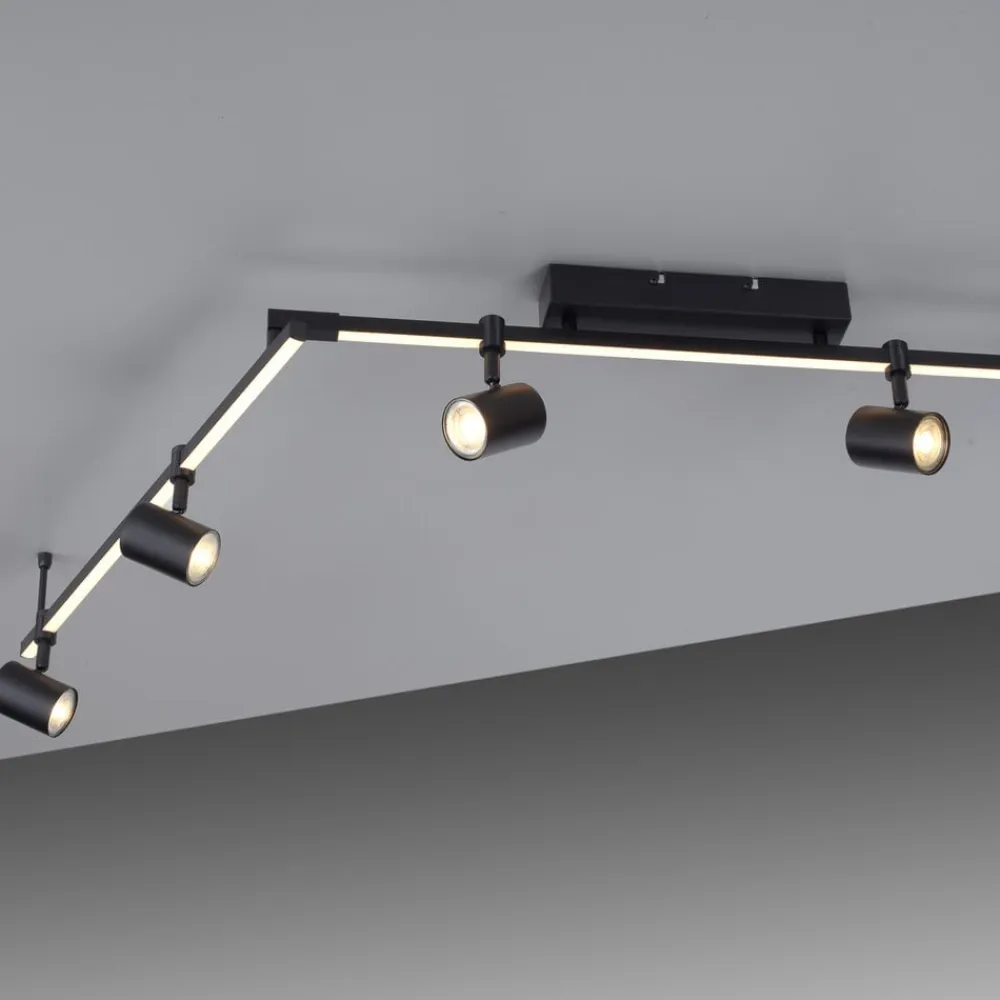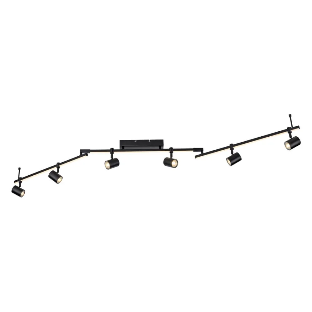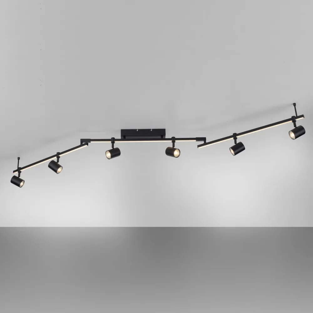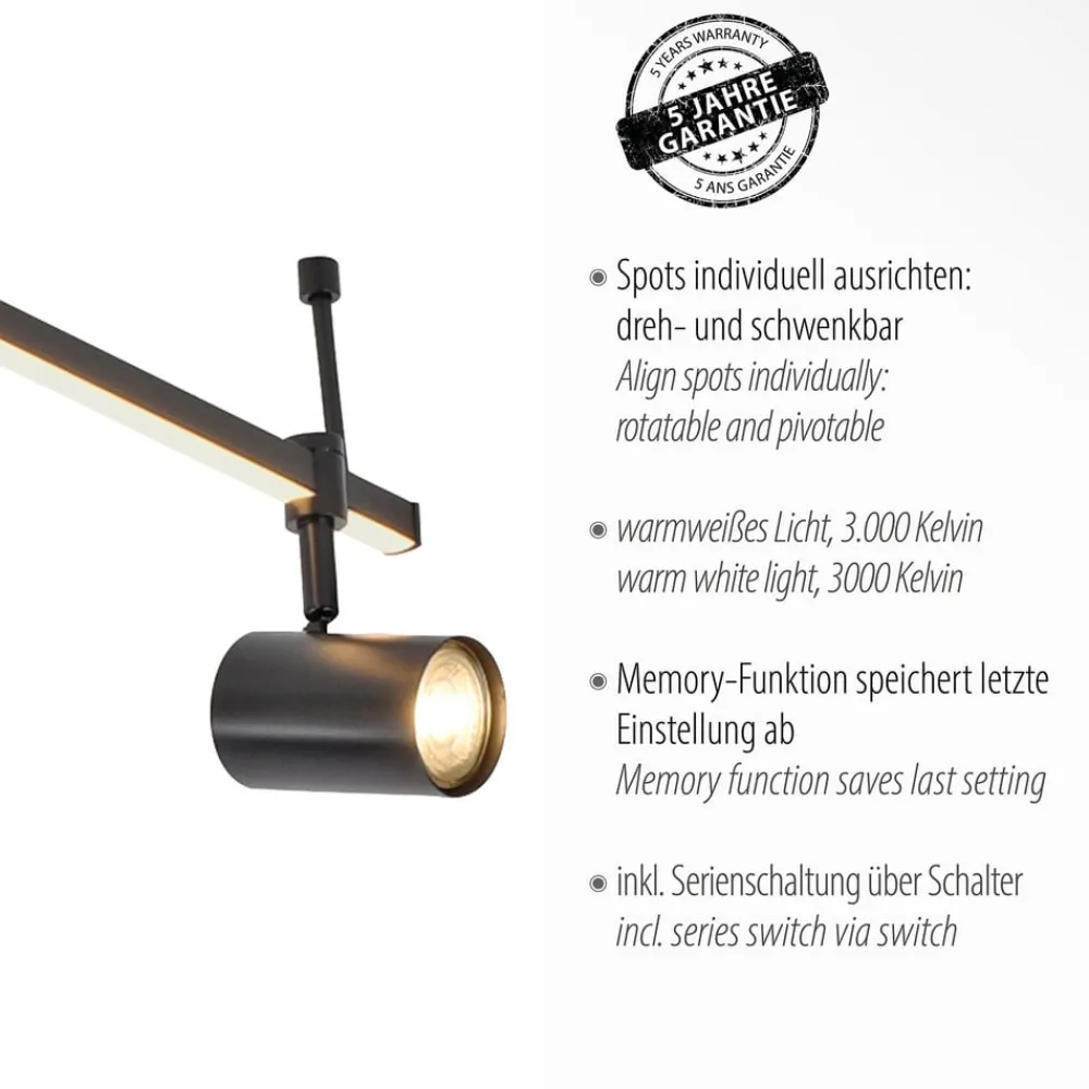 Justerbar LED-loftlampe Barik med seriebryder Den sorte spot-loftlampe Barik imponerer med sit teknisk moderne design. Loftlampens seks spots kan drejes og justeres på skinnen, så de kan placeres optimalt i rummet. Med en farvetemperatur på 3.000 Kelvin udsender loftlampen et behageligt varmhvidt lys. Skinnen, som spottene er fastgjort til, er også udstyret med en LED-spot, som giver det lille ekstra. Takket være den integrerede seriebryder kan vægkontakten bruges til at tænde begge lyskilder på samme tid, kun lyset på listen kan tændes, eller kun spotsene kan tændes. Seks GU10-pærer er inkluderet i leveringsomfanget. Dine sidste indstillinger gemmes automatisk ved hjælp af hukommelsesfunktionen. Loftlampen er også velegnet til rum med lavt til loftet takket være det lave ophæng.