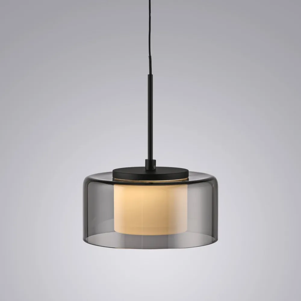 Moderne Rika LED-hængelampe af glas – dæmpbar via vægkontakt Den sorte Rika LED-hængelampe imponerer med sit moderne, enkle design. Takket være det røgfarvede glas og den varmhvide LED-pære udsender armaturet et blødt lys, der skaber en indbydende atmosfære over dit spisebord. Comfort-Lift-funktionen gør det nemt at justere højden. Takket være mekanismen, der er indbygget i baldakinen, er irriterende kontravægte ikke længere et problem. Højdejusteringssystemet gør det hurtigt og nemt for dig at justere højden på lampen, så den passer til din bolig. Lampen er udstyret med SimplyDim-teknologi. Denne funktion giver dig mulighed for nemt at dæmpe armaturets lysintensitet ved hjælp af den eksisterende lyskontakt. Lysdæmperteknologien styrer lysstyrken via koblingspulsen, så lyset kan dæmpes trinløst fra 100 % og ned til 10 % af lysintensiteten. Hvis lyset tændes igen mindre end 3 sekunder efter, at det er blevet slukket, starter dæmpningsprocessen. Når det har nået den lyseste (100 %) eller mørkeste værdi (10 %), forbliver det på denne indstilling i ca. 2 sekunder, før processen starter igen. Hvis lyset lyser med den ønskede lysstyrke under en proces, kan man spare på lysintensiteten ved at slukke for lyset. Hvis man tænder for lyset igen, lyser det med den gemte lysstyrke, og denne indstilling bevares. Det gør det muligt at justere lyset, så det passer til dine behov, og hurtigt finde det frem igen. Placer pendellampen over spisebordet, og indhyll rummet i en hyggelig atmosfære.