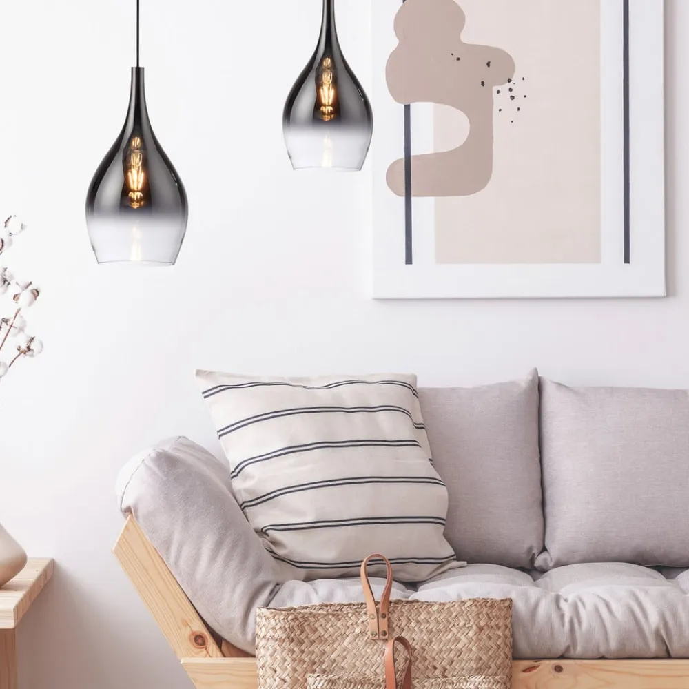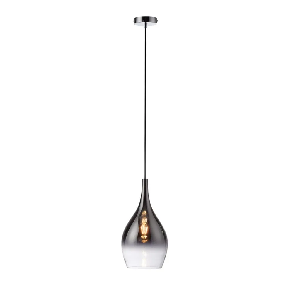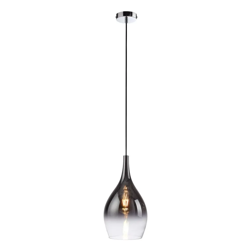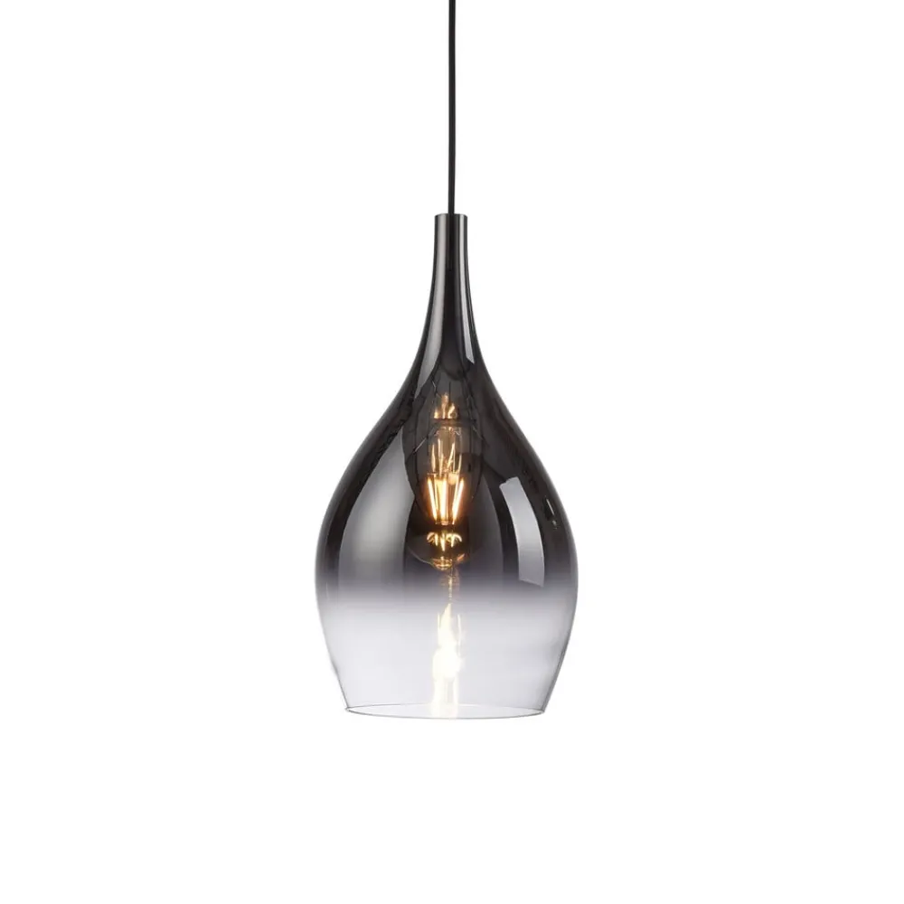 Pilua hængelampe med lampeskærm i røget glas Denne smukke hængelampe ved navn Pilua er særligt velegnet til montering over køkkenøer og spiseborde. Den passer perfekt ind i moderne indretningsstile. Hængelampens runde baldakin er farvet i en sofistikeret kromfarve. Den dråbeformede lampeskærm har en farvegradient fra røget grå til hvid, hvilket gør den til et HighLight i dit hjem. Lampen er udstyret med en E27-pære.