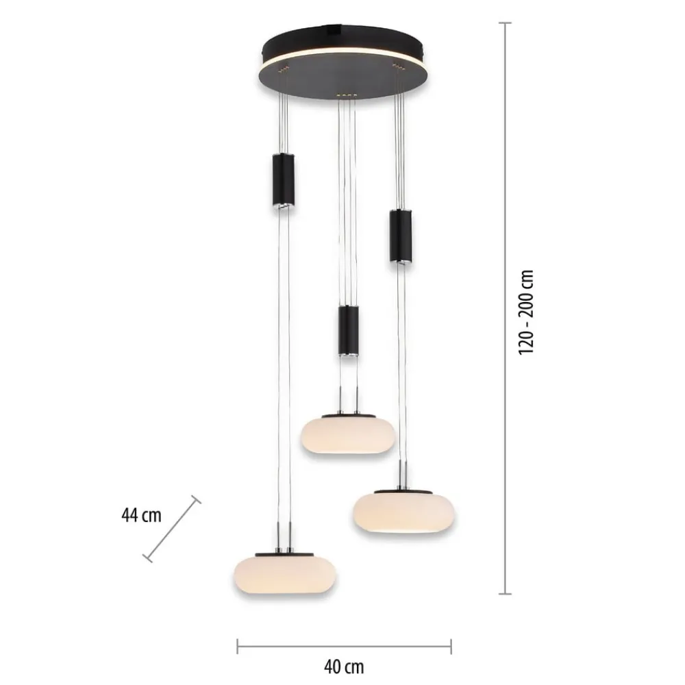 Højdejusterbar LED-pendellampe Q-ETIENNE i rundelformDen tre-lampe LED-pendellampe Q-ETIENNE kan ideelt bruges til at belyse spisebordet eller stuebordet. De tre afrundede lyskilder er lavet af glas, hænger ned i forskellige højder og kan justeres i højden ved hjælp af et kabeltræk. Med den medfølgende infrarøde fjernbetjening er det muligt at regulere lysstyrken og justere lysfarven fra varm til universalhvid. Desuden kan der vælges forskellige lysscenarier, og hukommelsesfunktionen kan anvendes. Q-ETIENNE er ZigBee-kompatibel og kan integreres i et tilsvarende kompatibelt smart home-system. Armaturet kan derefter også styres via app eller stemmestyring.Tekniske data/kompatibilitet:- Belyst loftboks- Dæmpbar- Højdejusterbar fra 120 til 200 cm- Lystemperatur justerbar fra varm hvid til universalhvid- Hukommelsesfunktion- Skift af op til 20 individuelle Q-armaturer eller Q-lamper til maks. 3 grupper med kun én Q-fjernbetjening. 3 grupper med kun én Q-fjernbetjening- ZigBee-kompatibel- kan styres med fjernbetjeningen- stemmestyring via Echo (4. generation), Echo Studio samt Echo Show 10 (3. generation) direkte mulig- ved integration i et ZigBee-baseret smart home-system også praktisk styrbar via app eller stemmestyringBemærk: For integration i et smart home-system eller app-styring kræves en bro; denne er ikke en del af leveringsomfanget