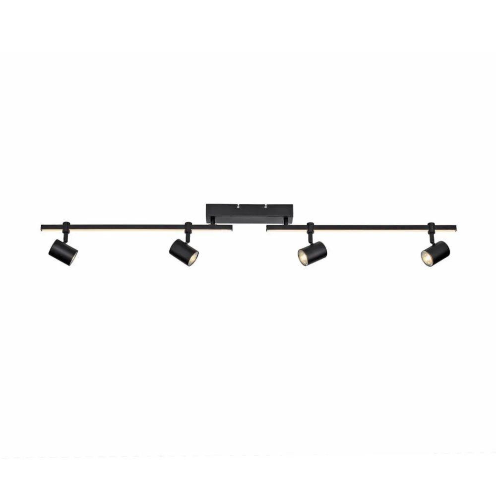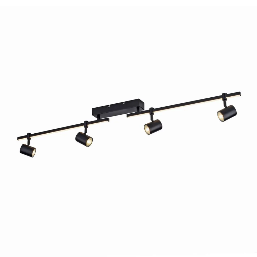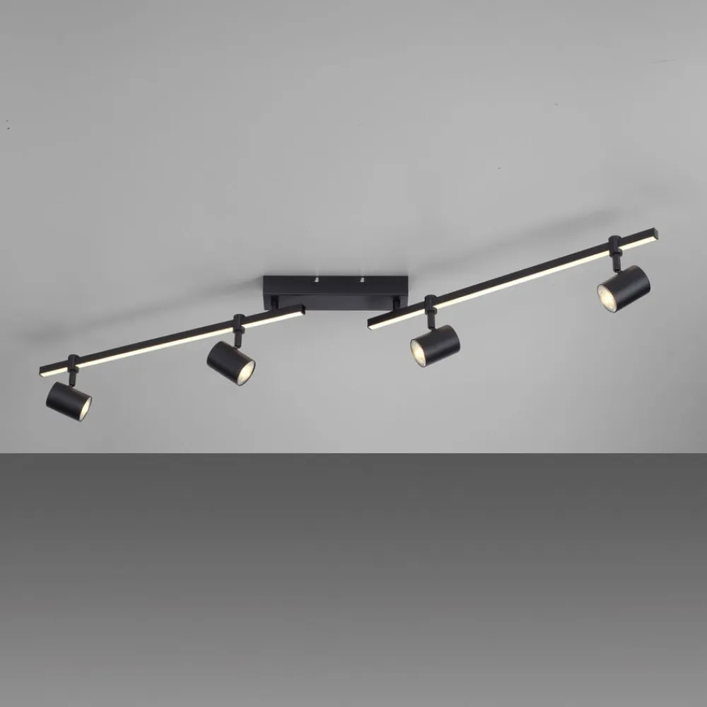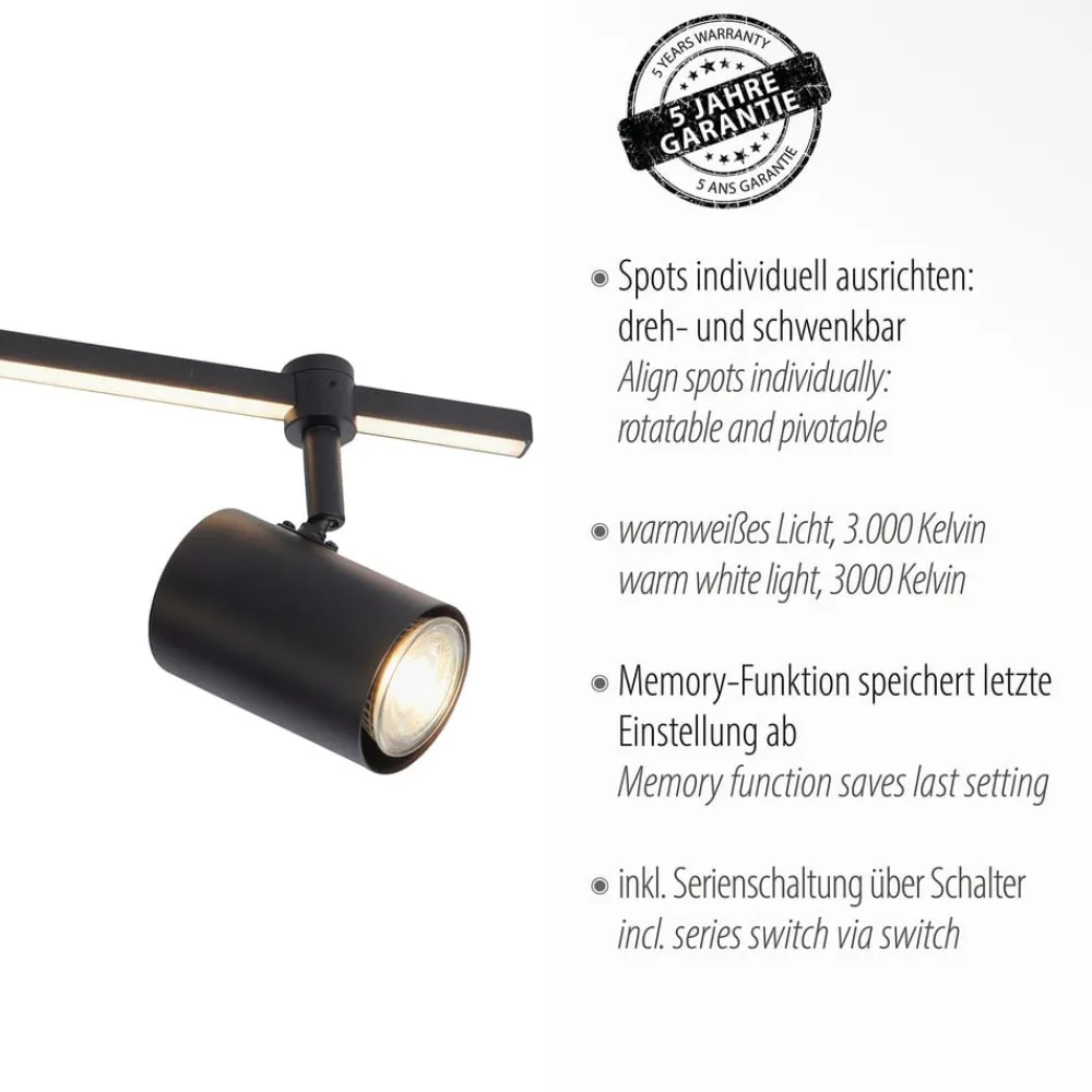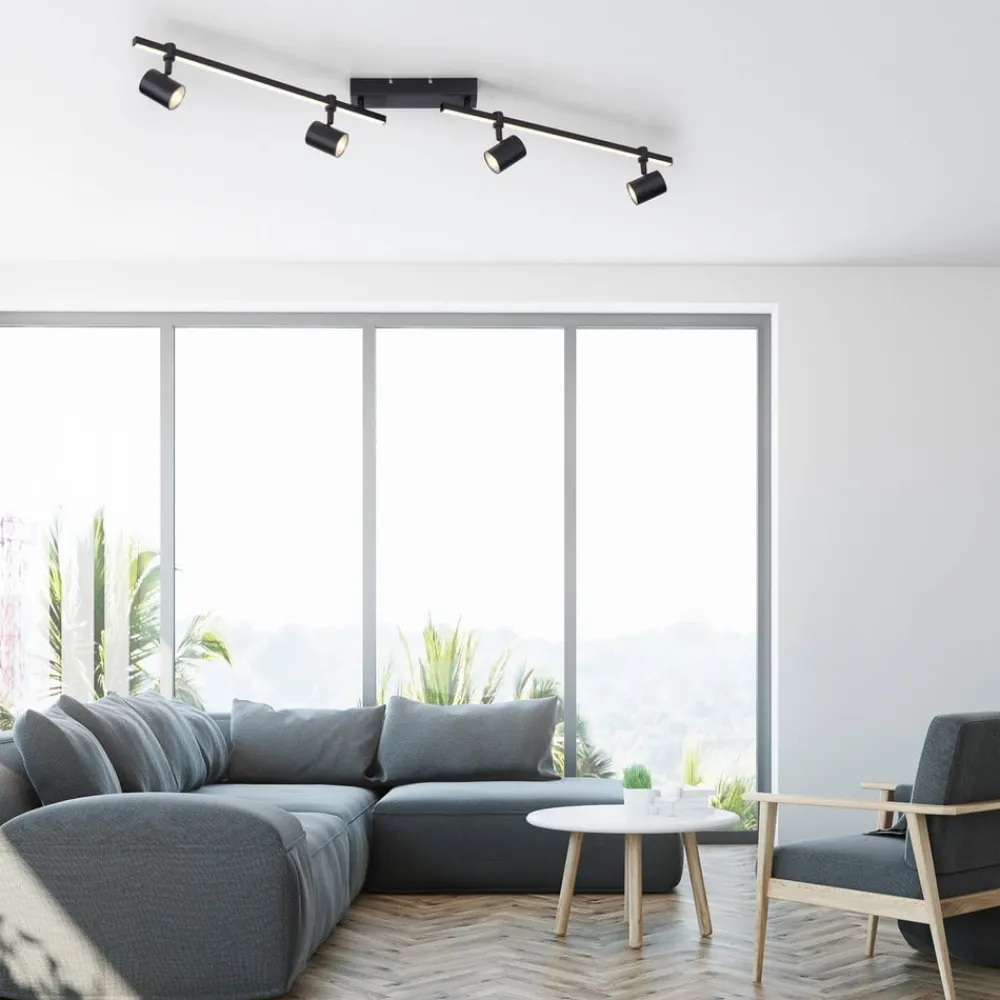 Barik LED-loftspot med fire spots og lyskilder, der kan skiftes separat Det sorte Barik-loftspot imponerer med sit moderne og tekniske design. De fire justerbare spots kan justeres fleksibelt på skinnen for at fordele lyset optimalt i rummet. Armaturet kan installeres på væggen eller i loftet og giver et behageligt, varmhvidt lys. Skinnen er også udstyret med en LED-strip, der skaber en særlig lysstemning. Med den integrerede seriebryder kan begge lyskilder styres enten sammen, kun LED-spottet eller kun spottene via vægkontakten. Fire pærer er inkluderet i leveringsomfanget. Takket være hukommelsesfunktionen gemmes de sidste indstillinger automatisk. På grund af det lave ophæng er lyset også velegnet til rum med lavt til loftet.