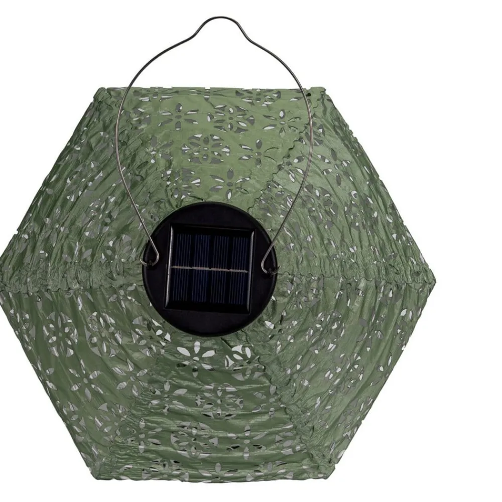 Grøn LED-dekorativ lanterne Sunshine Flower med solcellemodul og genopladeligt batteri til udendørs brug LED-solcellelanternen Sunshine Flower lavet af grøn Tyvek® polyethylenfleece er et ægte highlight til udendørs brug. Ved at iscenesætte den perfekt i haven tilføjer den en særlig charme til hjemmet. Om dagen smelter den harmonisk ind i de naturlige omgivelser, og om natten skaber den smukke lyseffekter. Håndtaget gør det nemt at hænge det dekorative armatur i træer eller på baldakiner. Takket være et ekstra, kortere beslag er det også muligt at hænge det på jordspyd eller på pæle, når man går tur med børnene om efteråret. Med sit bløde lys skaber Sunshine Flower en behagelig atmosfære og indbyder til at blive hængende. Solcellelanternen er udstyret med et genopladeligt batteri, som oplades af et solcellemodul på toppen i løbet af dagen. Når mørket falder på, tændes lyset automatisk. Lyset holder i op til 6 timer pr. opladning. Stænktæt i henhold til IP44.