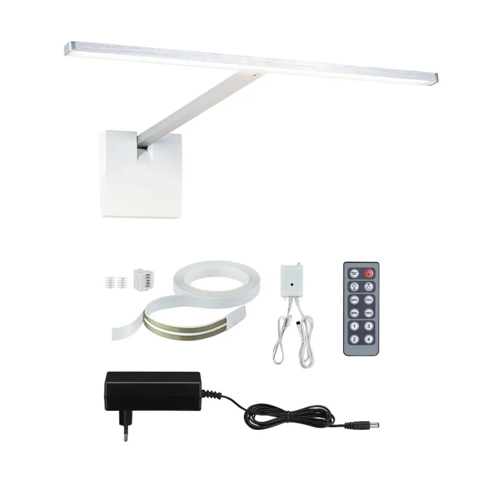 Assistance Xana LED-gallerilampe i et komplet sæt Assistance Xana-komplettsættet består af en lampe med et langt, smalt lyselement, en MaxLED Invisible Connector, en plug-in-transformer med euro-stik og en fjernbetjening (MaxLED controller) og er derfor klar til installation. Takket være plug-in-transformertilslutningen kan armaturet installeres på mange forskellige måder, og det flade kabel med stik kan males eller tapetseres over, så det bliver usynligt. Grundsættet kan udvides – i alt 6 armaturer kan tilsluttes en plug-in-transformer, hvilket gør det muligt at lave skræddersyede designs med dette system. Lyselementet kan justeres på lampearmen. Den lille fordybning på vægbeslaget gør det muligt at hænge et billede op (maks. vægt 3 kg).