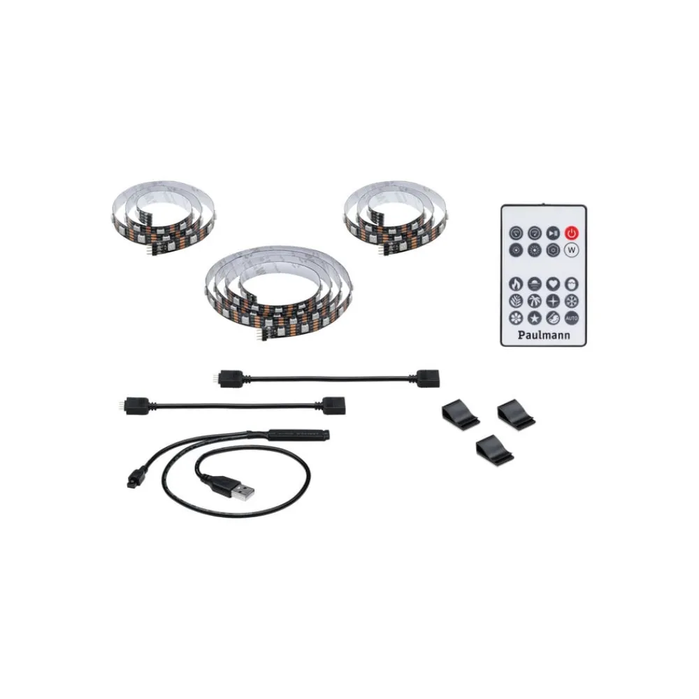 Farverig TV-baggrundsbelysning: EntertainLED LED-stripsæt til TV, USB Spektakulære lyseffekter i stuen: USB TV LED-strips fra Paulmann til TV’et fra EntertainLED-serien giver tresidet belysning bag TV’et. Det indirekte omgivelseslys skaber effektfulde lysaccenter med sit behagelige, roligt skiftende og dynamiske farvespil. Det hvide lys kan også indstilles, og intensiteten kan dæmpes med den medfølgende fjernbetjening. Lamellerne sætter scenen i hjemmets underholdnings- og gamingområde. Den praktiske styring via infrarød fjernbetjening gør det til en leg at konfigurere utallige brugerdefinerede farvegradienter.Tekniske egenskaber- TV-baggrundsbelysning til TV’et Sæt med tre strips og stik med fjernbetjening, klar til øjeblikkelig brug- RGB-farveskift og hvidt lys- Kan dæmpes trinløst via fjernbetjening- Kan betjenes via USB- Hukommelsesfunktion gemmer det sidst anvendte niveau, indtil næste gang den tændes- Energibesparende LED-teknologi (sparer op til 80% sammenlignet med konventionelle glødelamper)- Enkelt plug-in-system til hurtig installation- Kan ikke forlænges- Kan ikke kombineres med Paulmann YourLED- eller MaxLED-strips