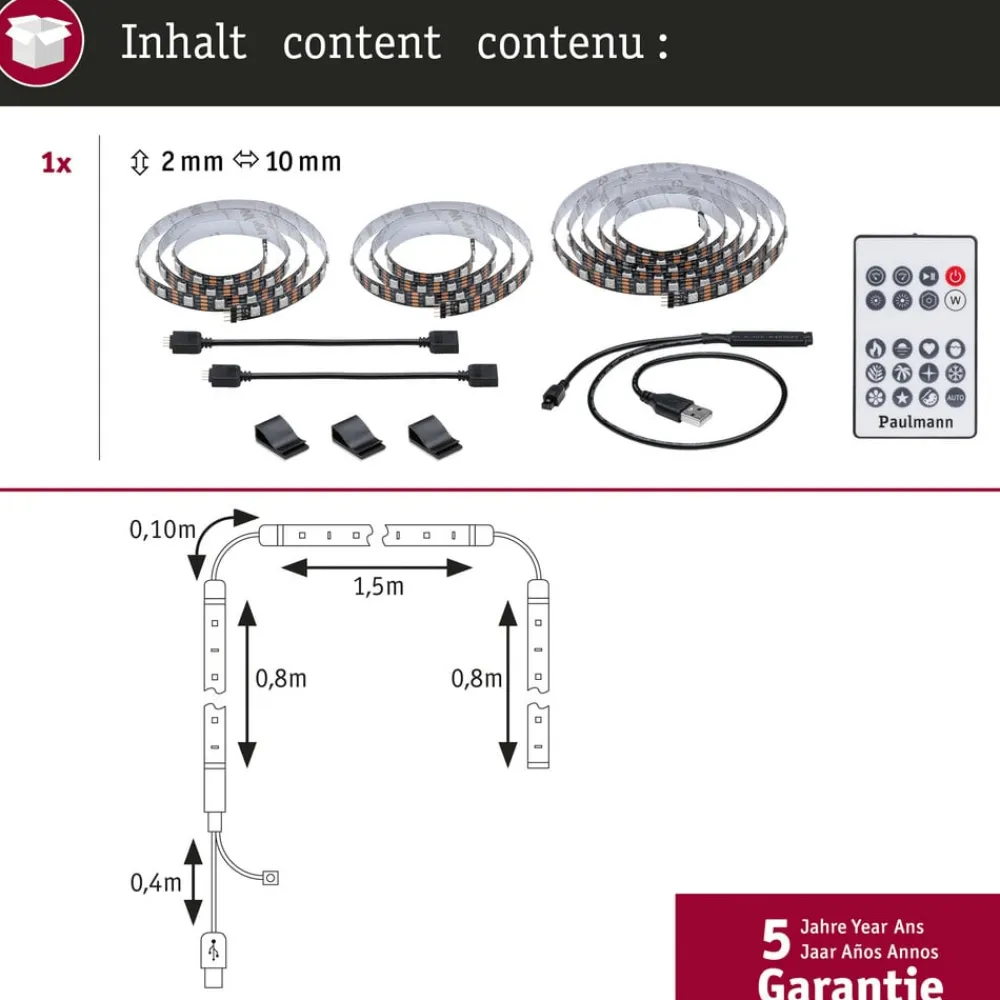 Farverig TV-baggrundsbelysning: EntertainLED LED-stripsæt til TV, USB Spektakulære lyseffekter i stuen: USB TV LED-strips fra Paulmann til TV’et fra EntertainLED-serien giver tresidet belysning bag TV’et. Det indirekte omgivelseslys skaber effektfulde lysaccenter med sit behagelige, roligt skiftende og dynamiske farvespil. Det hvide lys kan også indstilles, og intensiteten kan dæmpes med den medfølgende fjernbetjening. Lamellerne sætter scenen i hjemmets underholdnings- og gamingområde. Den praktiske styring via infrarød fjernbetjening gør det til en leg at konfigurere utallige brugerdefinerede farvegradienter.Tekniske egenskaber- TV-baggrundsbelysning til TV’et Sæt med tre strips og stik med fjernbetjening, klar til brug med det samme- RGB-farveskift og hvidt lys- Kan dæmpes trinløst via fjernbetjening- Kan betjenes via USB- Hukommelsesfunktion gemmer det sidst anvendte niveau, indtil næste gang den tændes- Energibesparende LED-teknologi (sparer op til 80% sammenlignet med konventionelle glødelamper)- Enkelt plug-in-system til hurtig installation- Kan ikke forlænges- Kan ikke kombineres med Paulmann YourLED- eller MaxLED-strips