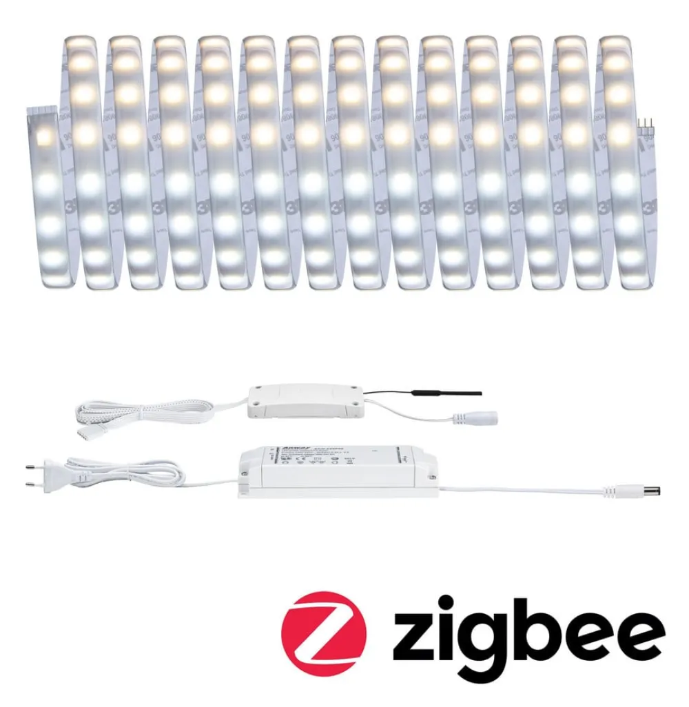 Klar til integration i et smart home-system: ZigBee-kompatibelt basissæt LED strip MaxLED 500 med controller og strømforsyningsenhed, CCT-funktion Med basissættet af LED strip MaxLED 500 er integration i et smart home-system lige så let som installation. Ved hjælp af stikforbindelser kan alt monteres hurtigt og nemt, og den selvklæbende underside gør installationen endnu nemmere. For at betjene MaxLED fra sofaen, dæmpe lysstyrken og ændre farvetemperaturen er det nødvendigt at integrere den i et smart home-system baseret på ZigBee. Philips Hue eller IKEA Tradfri, for eksempel, kommer her i betragtning. Paulmann tilbyder naturligvis også selv en tilsvarende bro. Den hedder Gateway smik, har en gratis app til iOS og Android og kan købes separat som tilbehør. For dem, der foretrækker en klassisk fjernbetjening i stedet for en smartphone, tilbyder Paulmann Gent-fjernbetjeningen, som ikke kræver en bro. Den kan også bruges til at styre alle MaxLED-funktioner. Gent, samt en ZigBee-kompatibel 2-gang vægkontakt, fås separat via tilbehør. Tekniske egenskaber / kompatibilitet: – Komplet sæt inkl. LED-strip og strømforsyningsenhed – Kan udvides (se tilbehør) – ZigBee 3.0-kompatibel – kompatibel med Paulmann Smart Home-fjernbetjening og vægkontakt (se tilbehør) – kompatibel med Smart Home-systemer baseret på ZigBee, f.eks. Philips Hue eller IKEA Tradfri – dæmpbar og farvetemperatur justerbar (efter integration i et Smart Home-system) – selvklæbende på bagsiden, plug-in-system til nem installation og kan afkortes efter behov – fleksibelt materiale til brug på flade eller buede overflader Bemærk: For at bruge den intelligente lysstyring (dæmpning, CCT, betjening via app osv.) kræves der en separat ZigBee-fjernbetjening.), er det absolut nødvendigt med en separat ZigBee-bro eller en ZigBee-håndholdt sender (se tilbehør)
