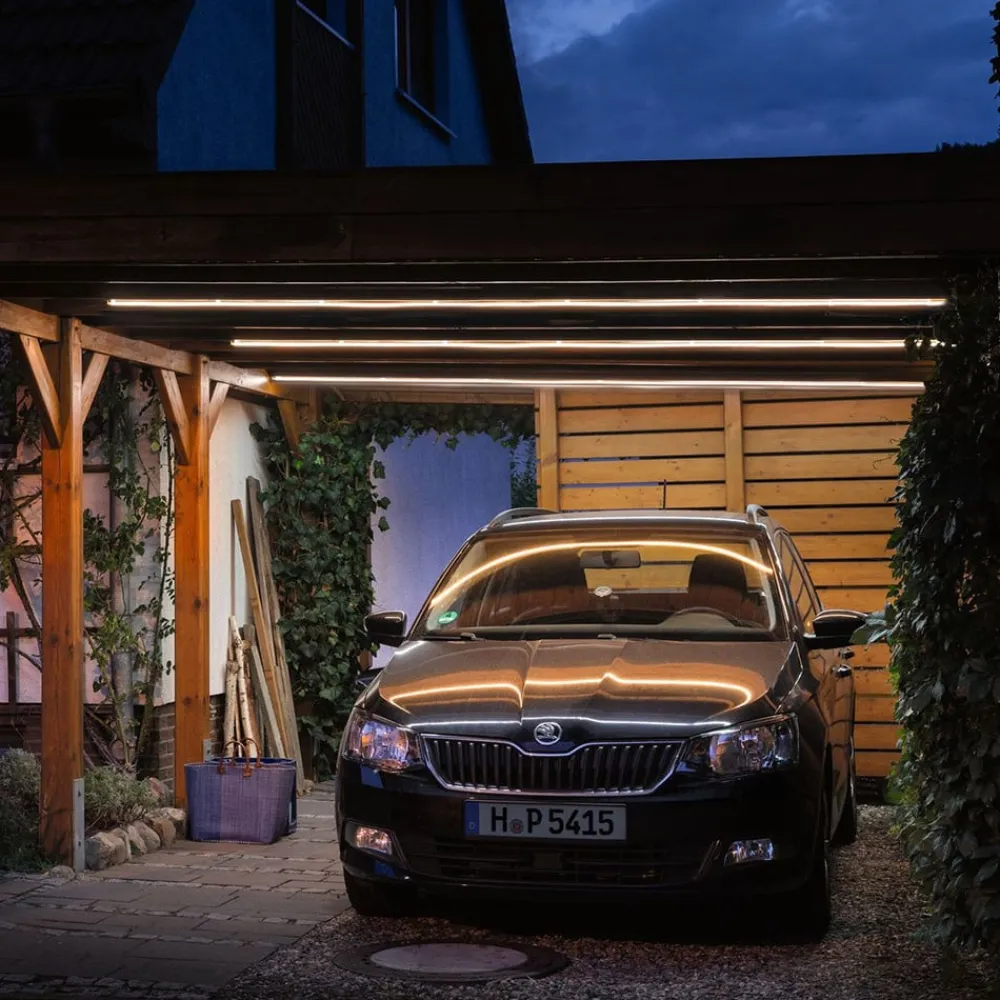 Lysende LED-strip – homogene lysaccenter til udendørsarealer På grund af sin længde kan denne LED-strip bruges til mange dekorative formål i udendørsarealer: Den pynter på tagkanter, carporte, balkoner og terrasser. SimpLED er lavet af fleksibelt materiale og kan lægges på både flade og ujævne overflader. Det er udstyret med mange LED’er, som giver en attraktiv dekorativ belysning på ejendommen. Resultatet er en jævnt oplyst lyslinje uden synlige LED-punkter. Silikonebelægningen beskytter LED’erne mod kontakt og fugt – Komplet sæt inkl. transformer og netstik – Kan ikke forlænges – Kan ikke kombineres med YourLED- og LED-strips