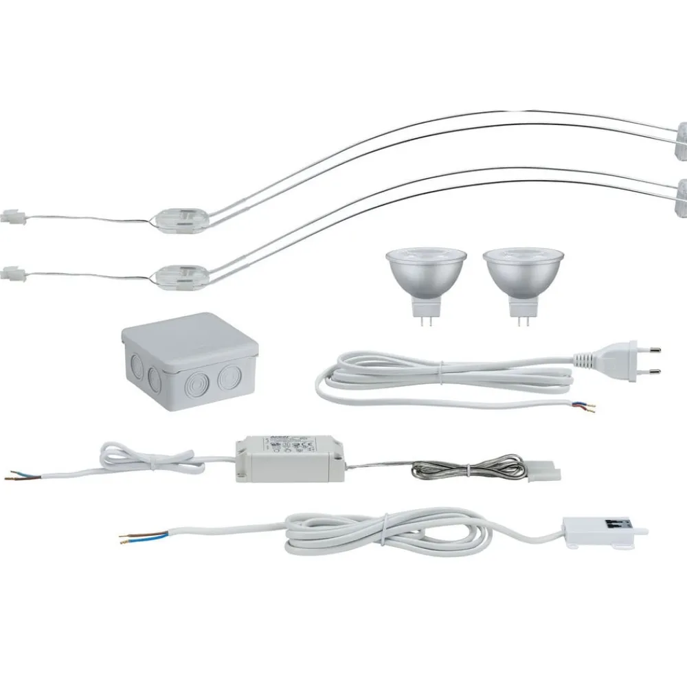 – Monterings- og forbindelsesmateriale, transformer, manuel afbryder, sensorkontakt og to GU5.3 LED-lamper er inkluderet