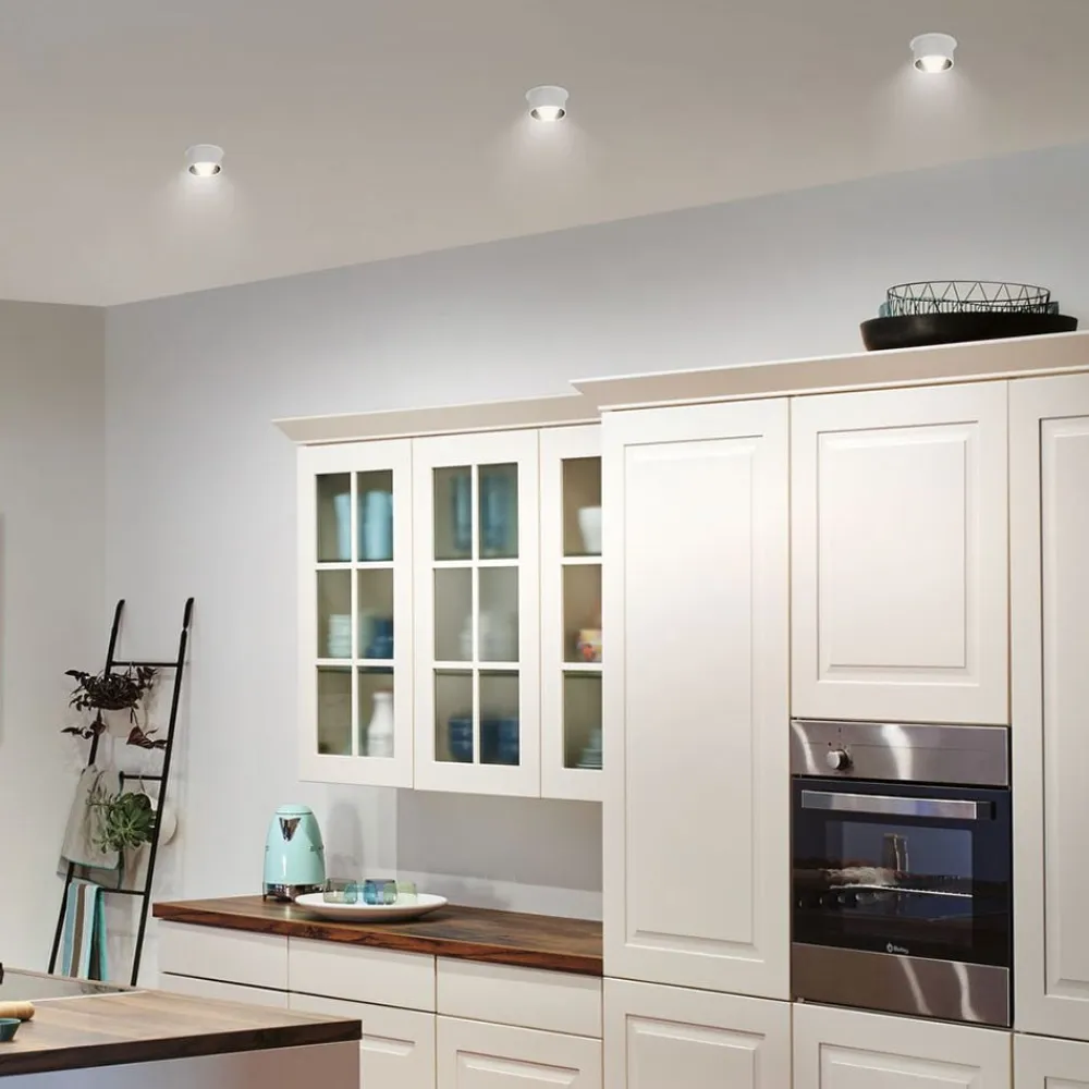 Tofarvet LED-indbygningslampe Gil i et sæt med tre – dæmpbar i 3 niveauer Indbygningslamper som Gil skaber lysaccenter i moderne boligområder: Denne LED-indbygningslampe i et sæt med 3 kan endda bruges i badeværelset, saunaen og andre fugtige rum takket være IP44-beskyttelsesgraden. Den dekorative cylinder stikker lidt ud. De dybere lyspunkter udsender varmt hvidt lys og teknisk brillans: De kan kobles sammen i det uendelige, og deres lys kan dæmpes i tre trin ved hjælp af den normale vægkontakt for at opnå den ønskede lysstemning: 100 %, 50 % eller 25 %. LED’erne er også udskiftelige og bør udskiftes af et specialfirma – 230 V direkte tilslutning