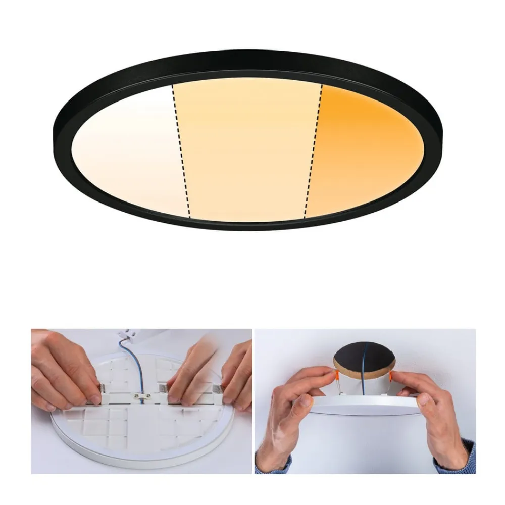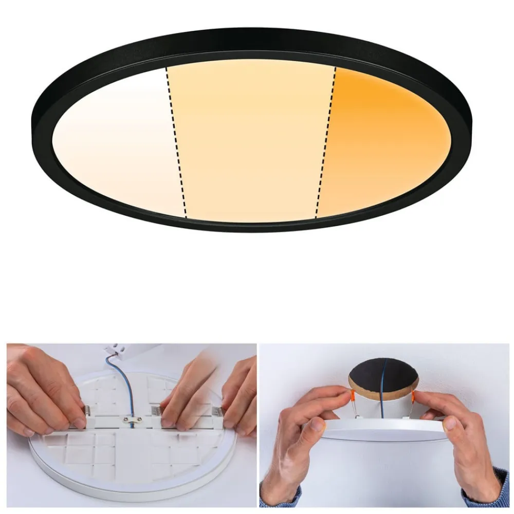 Dette Areo indbygningspanel kan ændres i lysfarve og dæmpes samtidig i tre trin uden ekstra udstyr fra universel hvid til hyggelig varm hvid. Denne funktion er især velegnet, hvis rummet skal bruges som arbejdsværelse og samtidig som et hyggeligt opholdsrum – sammenhængende opholdsrum som f.eks. et åbent stue-, køkken- og spiseområde er også ideelle anvendelsesområder for panelet. Takket være lysdæmper-varm-funktionen kan lysets farve og lysintensitet nemt ændres via den sædvanlige vægkontakt ved at klikke flere gange.