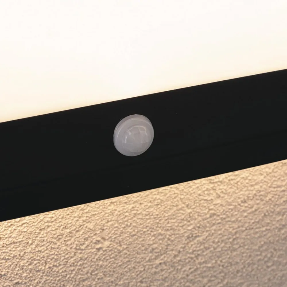 Lamina udendørs LED-væglampe i kantet form med sensor Lamina LED-væglampen til udendørs brug skaber en smuk atmosfære på enhver facade. Armaturet er udstyret med en baggrundsbelysning, en bevægelsessensor og en skumringssensor. Når mørket falder på, tænder lyset permanent med en lysstyrke på 20 % og et meget varmt, insektvenligt guldlys (2.200 K). Hvis bevægelsessensoren med en rækkevidde på 5 meter og et registreringsområde på 90° registrerer bevægelse, tændes varmhvidt lys (3.000 K) med 100 % lysstyrke. Efter 30 sekunder skifter lyset automatisk tilbage til 20 % guldlys. Lampen er også velegnet til loftsmontering, hvor sensoren er tilstrækkelig til en loftshøjde på 2,5 m. Lamina LED-væglampen til udendørs brug er lavet af plast og har fået tildelt mærket “havvandsbestandig”, hvilket betyder, at den også kan bruges i kystområder uden problemer.