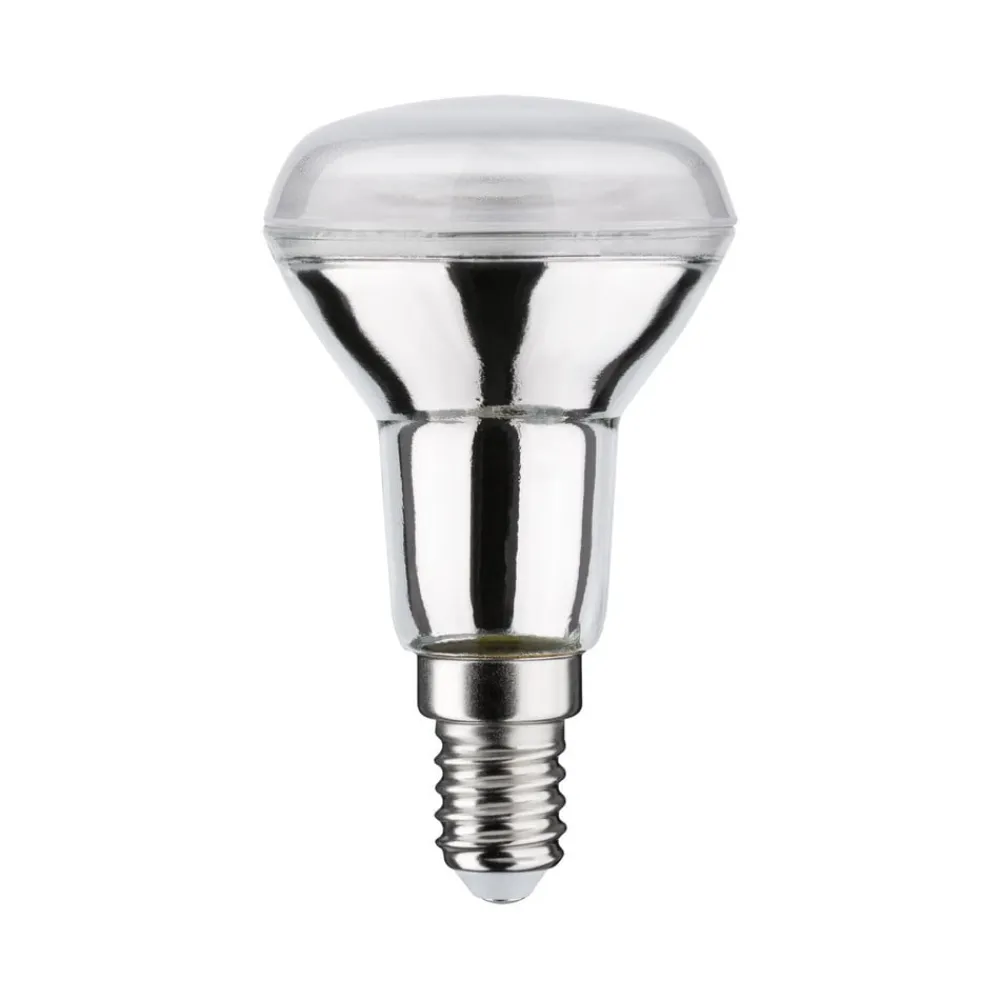 E14 5W LED-reflektor R50 fra Paulmann med sølvfarvet glashus, universalhvidDenne ikke-dæmpbare LED-reflektorlampe R50 med E14-sokkel udsender universelt hvidt lys med en udstrålingsvinkel på 36°. Lampen er særligt velegnet til spots og spotlights.