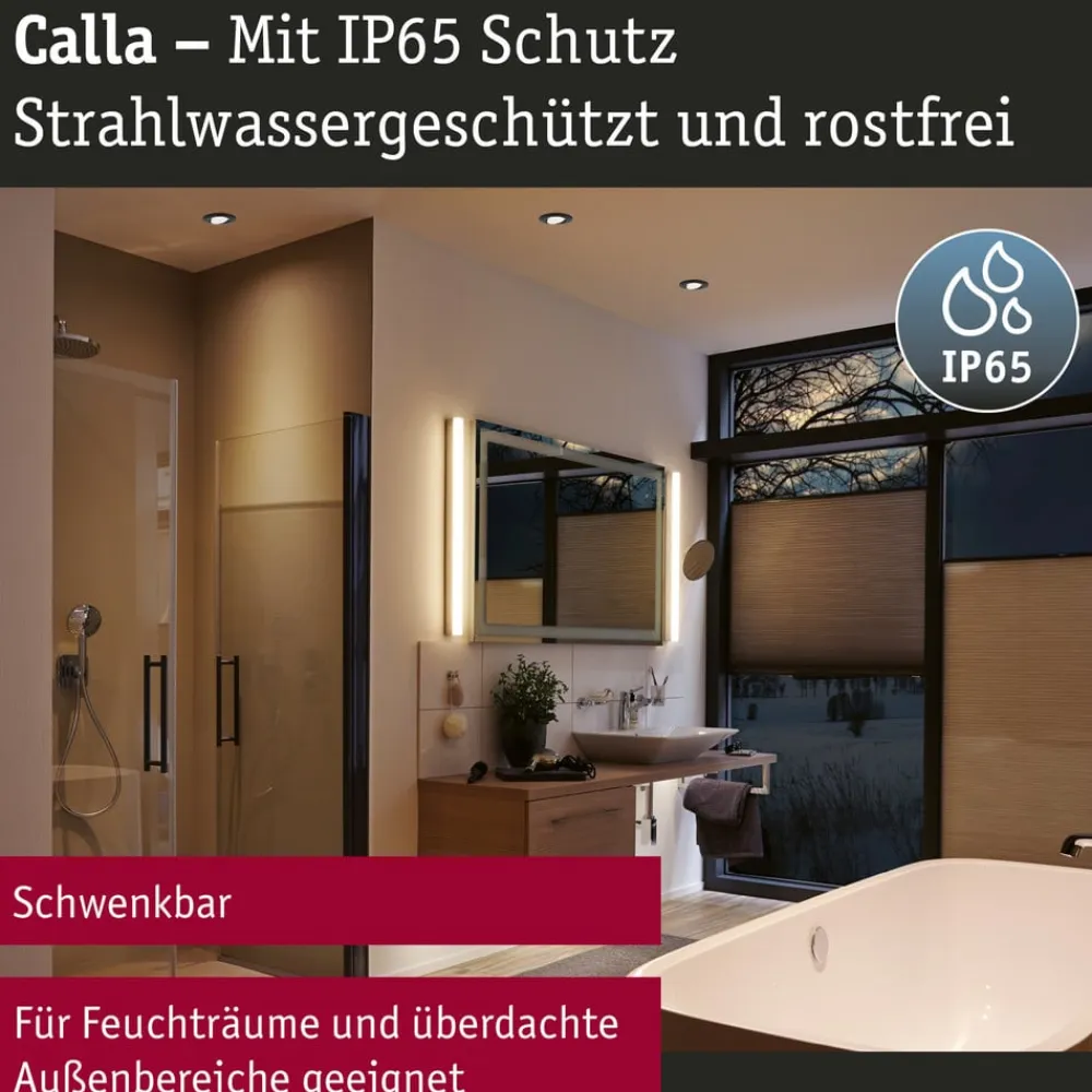 Vandstrålebeskyttet Calla LED-indbygningsspot i sæt med 10 stk. til loftsmontering i udendørs og fugtige områder Med Calla tilbyder Paulmann en mester i alsidighed. Fra udendørs og fugtige områder, salgs- og kontorlokaler til badeværelser og gange i private hjem fungerer den indbyggede LED-lampe som en effektiv, men visuelt diskret lyskilde i loftet. Den praktiske 10-pak kan også bruges til at udstyre større rum eller områder. Modulet med de energieffektive LED’er, som har en udstrålingsvinkel på 100° og kan drejes inden for et område på 30°, er placeret i midten af en plastcirkel. Det universelle hvide lys udsendes blændfrit gennem en mat afdækning. Indbygningsspottene kan tilsluttes direkte til 230 V-udgangen og kobles sammen.