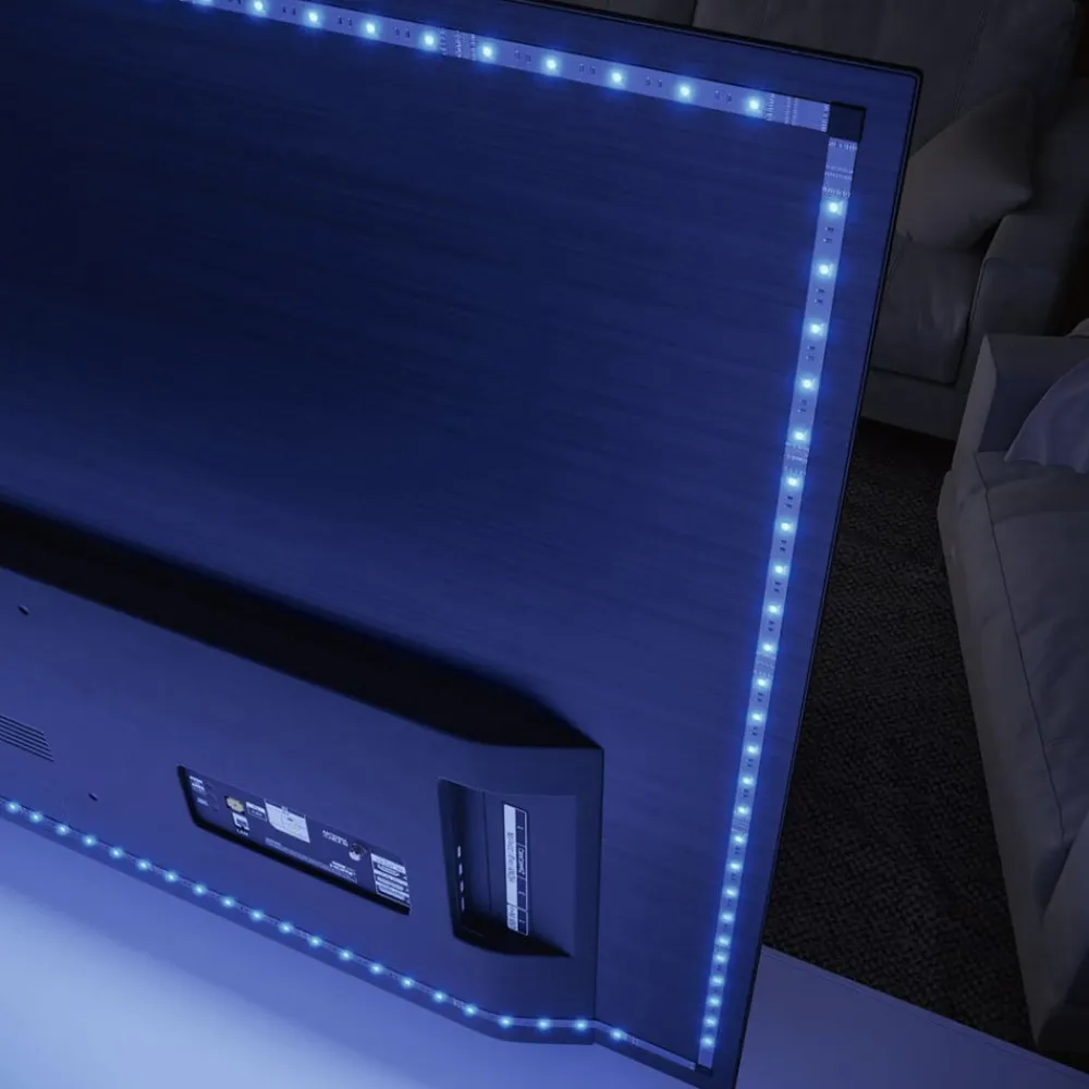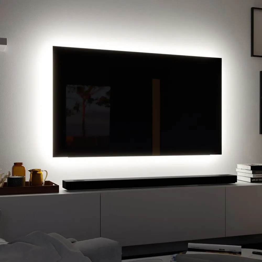 Farvet baggrundsbelysning af tv’et er en leg med dette Comfort Set Max LED 250 fra Paulmann. Sættet består af fire LED-strips, fire hjørnestik, tilslutningskabler og en fjernbetjening. Der kan føres strøm ind mellem de fire strimler i alle fire hjørner. Takket være LED-baggrundsbelysningens egen strømforsyning kan lyset tændes uafhængigt af tv’et. Farvet eller hvidt lys, dæmpning af belysningen eller endda forskellige farveskift kan indstilles nemt ved hjælp af den medfølgende fjernbetjening.