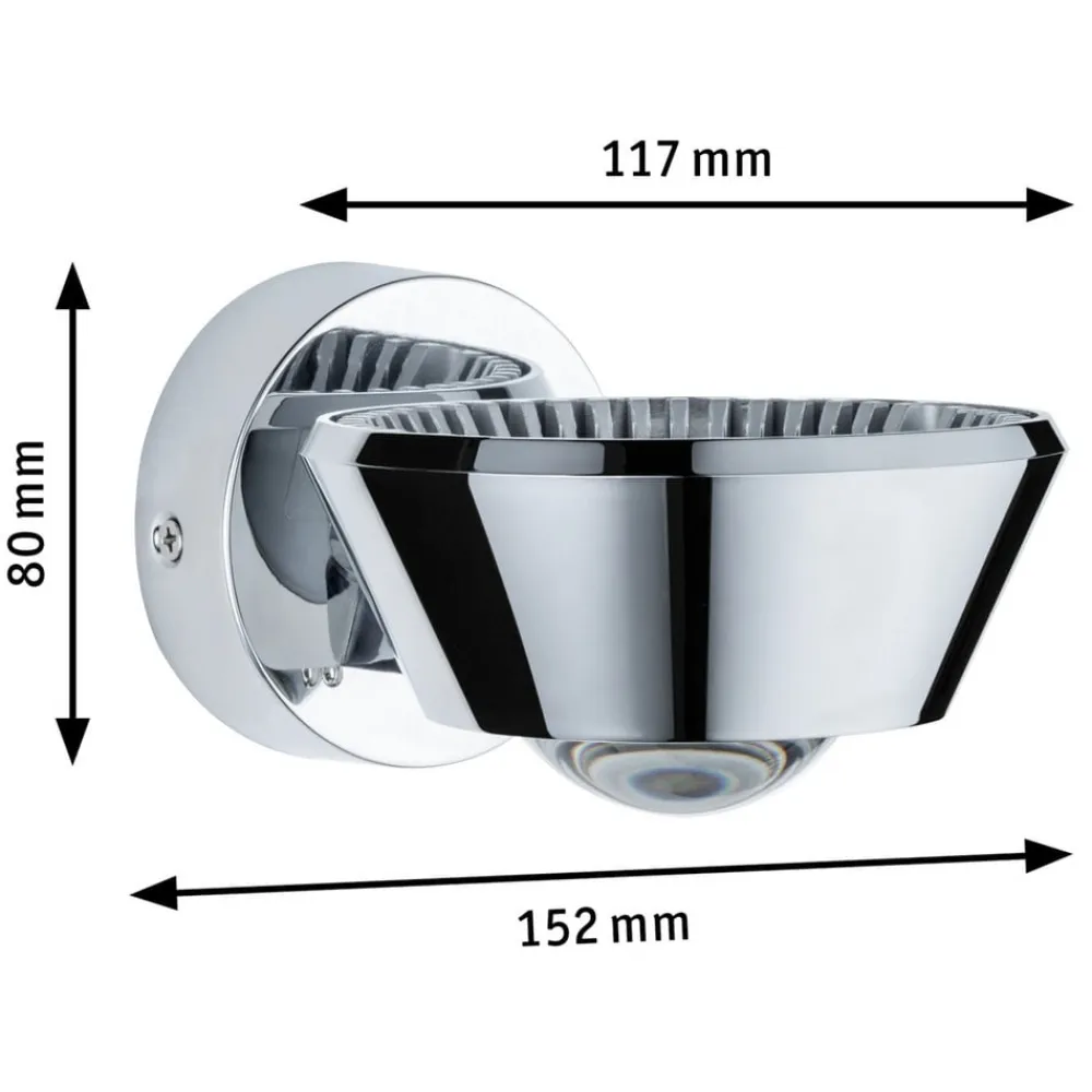 Denne LED-væglampe er et spothoved med en LED-lyskilde, der skinner opad og nedad. Man kan med en sprængring anbringe en dikroitisk folie (inklusiv) på glaslinsen i den nedre del, der giver særlige lyseffekter. Spotten kan vippes 180°, så der ved at lyse på væggen kan skabes indirekte belysning. Da den er IP44-beskyttet mod vandstænk kan lampen også uden problemer anbringes på badeværelset.