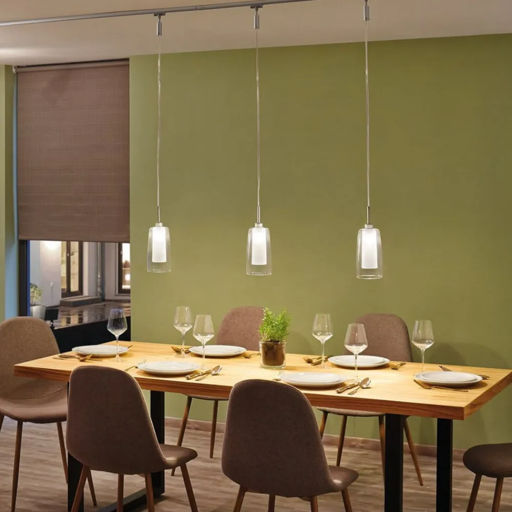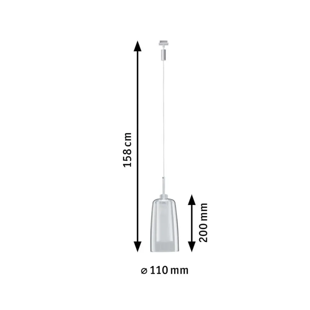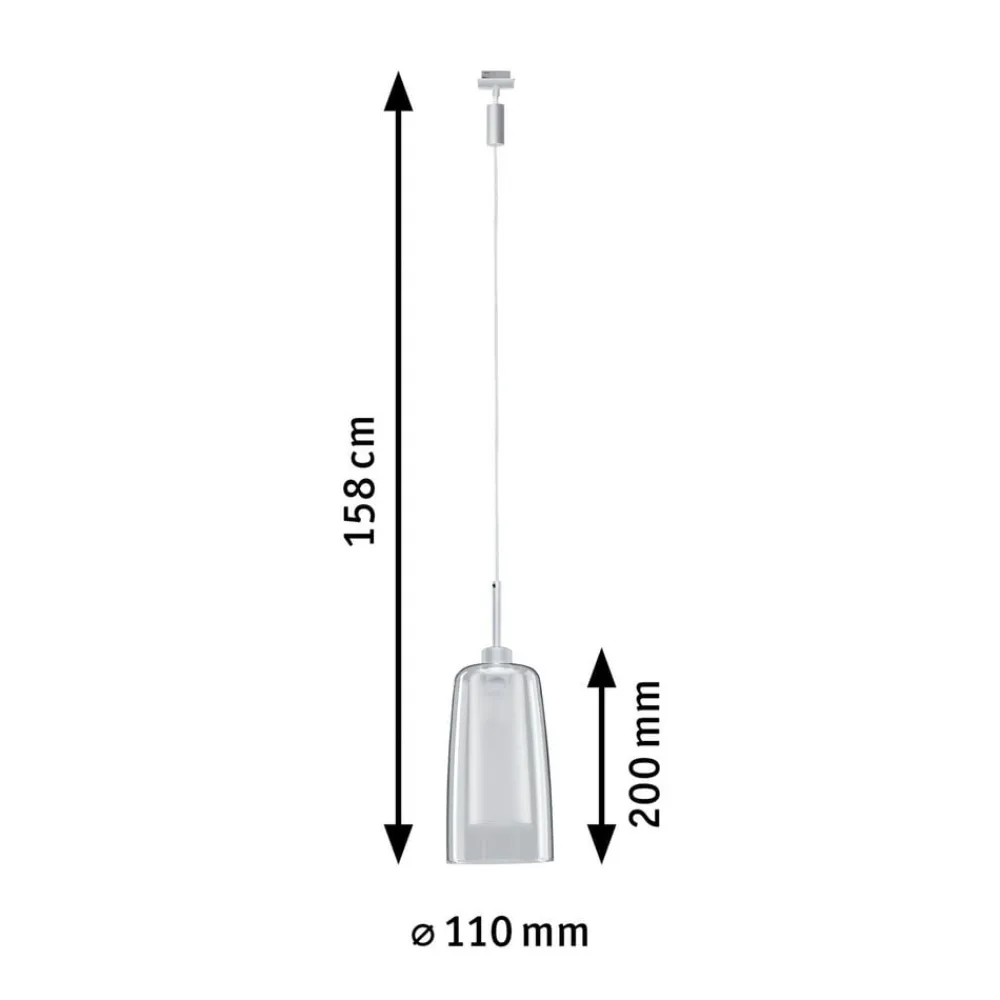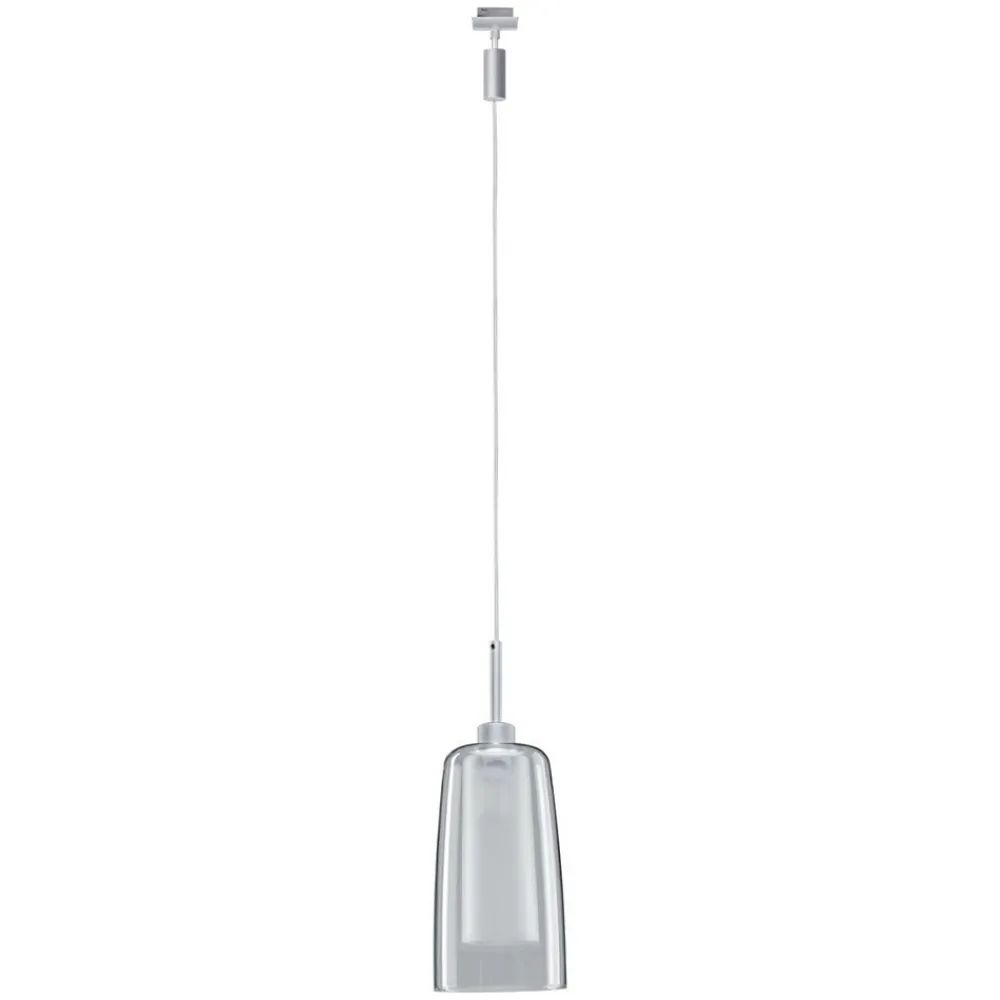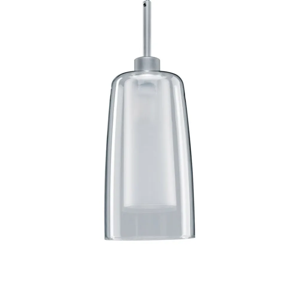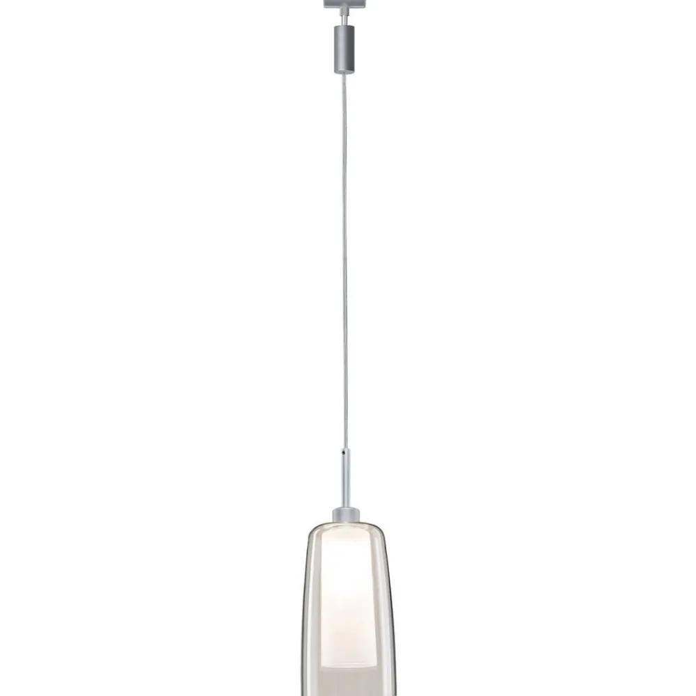U-skinnesystemet kan udstyres med dette pendellysarmatur, f.eks. til belysning af et bord eller en disk. Pendellampens skærm består af to lag: en indre skærm af satineret glas og en større ydre skærm af gennemsigtigt glas.