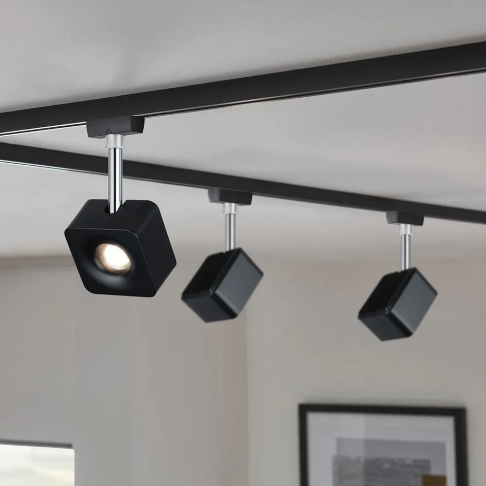 URail LED-spot Cube er en af mange komponenter i det praktiske URail skinnesystem og giver yderligere muligheder ved udformningen af et belysningskoncept. Den kan nemt integreres på en skinne og imponerer med sit diskrete udseende. Den sorte krop har en kantet form og ligner en terning. En kromfarvet konsol kommer ud af denne kube og er forsænket i kroppen. Det er muligt at justere armaturhovedet en smule, så man kan iscenesætte præcis det, man ønsker. LED-modulet er rundt og lidt forsænket i kuben. Lysemissionen er rettet i en vinkel på 65°. LED-spotlightet kan dæmpes via en ekstern lysdæmper.