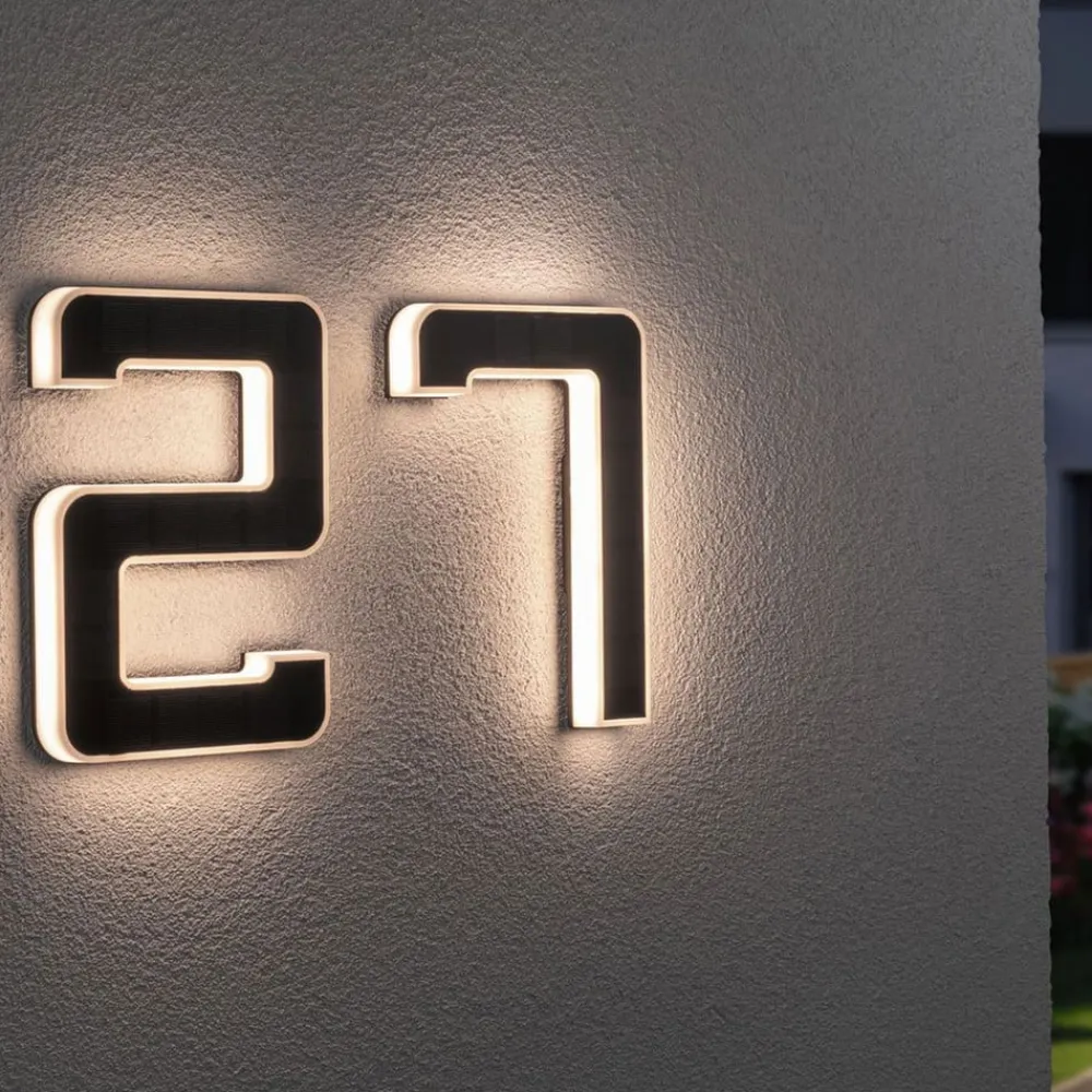 Udendørs solar-husnummer i sort med varmhvid belysning Solar-husnummeret er udstyret med et usynligt integreret solcellemodul, som oplader det integrerede, udskiftelige batteri i løbet af dagen, så det oplyste husnummer kan monteres på facaden, husmuren eller et andet sted helt uafhængigt af en strømtilslutning. Så snart det bliver mørkt, oplyses husnummeret indirekte af de integrerede, varmhvide LED’er. Lyset skinner sidelæns gennem nummerets satinerede ramme – Maks. belysningstid med fuldt batteri 8 timer – Batteriopladningstid 12 timer – Batteri 1 x AAA 1,5V (micro), medfølger