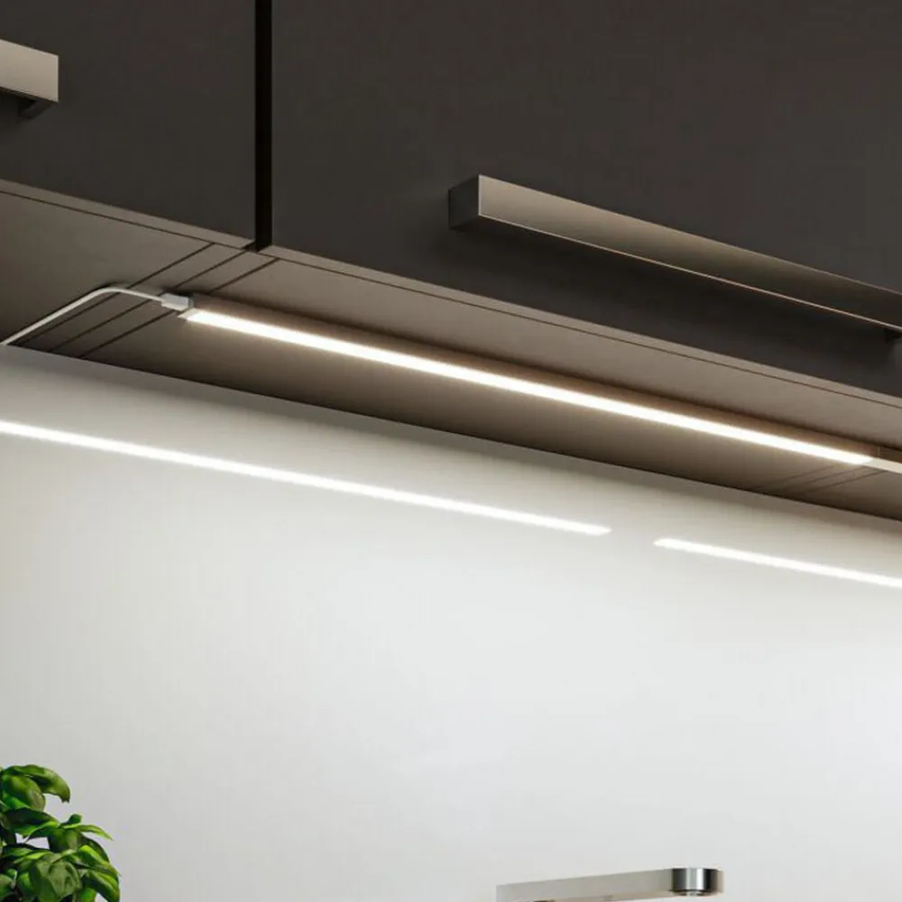 Moderne køkkenbelysning med bevægelsesstyring og justerbar lysfarve – LED underskabslampe Inline, startsæt med to lamper LED underskabslampen Inline er designet til funktionel belysning af køkkenets arbejdsflader. Den består af en slank aluminiumsprofil og en diffusor med overflader, der er nemme at rengøre. Der er integreret en PIR-sensor til betjening, så den kan betjenes berøringsfrit – praktisk og hygiejnisk. Lysfarven kan justeres fra varm hvid til dagslys ved blot at tørre sensoren af med hånden – Startsæt med to lamper, tilslutningskabel med plug-in-strømforsyningsenhed, tilslutningskabel, installationsmateriale – Kan suppleres med et forlængersæt (op til en maksimal samlet effekt på 24 W) – PIR-sensoren på den første lampe bruges til at styre alle andre tilsluttede lamper sammen – Hukommelsesfunktion gemmer den valgte lysfarve