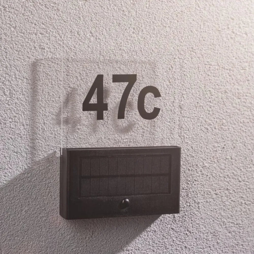 Solar LED husnummerlampe Neda Solar husnummerlampe Neda er særligt velegnet til udendørs vægge, hvor der ikke er nogen direkte strømforbindelse. Belyste husnumre gør det lettere for gæster og postbude at finde det rigtige nummer i mørke. Sollyset kan nemt placeres hvor som helst. Batteriet oplades i løbet af dagen af solstråling og frigiver derefter den lagrede energi ved at tænde lyset. Lyset tændes automatisk af skumringssensoren. Husnummeret drives med 20 er lysudgang efter mørkets frembrud. Så snart en person nærmer sig, og der registreres bevægelse inden for sensorens detektionsområde, skifter lyset til 100 % i 15 sekunder. Med en lysfarve på 2.200 K er solarmaturet særligt insektvenligt, fordi denne værdi ligger uden for insekternes synlige område, så de ikke tiltrækkes af den ekstra lyskilde. Det beskytter aktivt insekter uden at negligere fordelene for mennesker. IP44 – beskyttelse mod vandstænk, selv udendørsLadetid med solorientering 6 – 8 timer, lysvarighed 8 – 10 timer.