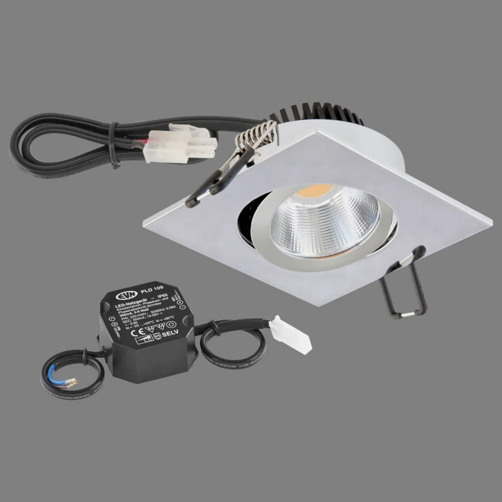 Firkantet og drejelig LED-indbygningslampe PC20 med strømforsyning LED-indbygningslampen PC20 er ikke kun drejelig. Den har også et 30 cm langt tilslutningskabel med AMP-stik og er også velegnet til møbelkonstruktion. Den kraftige COB-LED giver pålideligt god belysning i hele rummet. Det pulverlakerede aluminiumshus er slankt og afrundet af et klart glaspanel. Ideel som spotlight, til effektbelysning eller som klassisk downlight i række – egnet til møbelkonstruktion (brandbeskyttelsesmærke MM) – COB LED – inkl. LED-strømforsyning (tilslutningskablets længde 15 cm) – dæmpbar via forkant- og bagkantfasedæmper