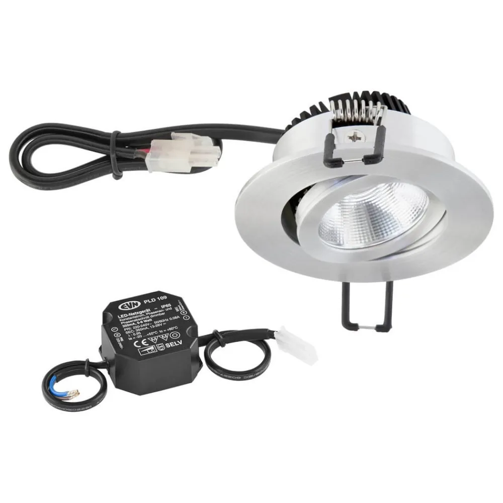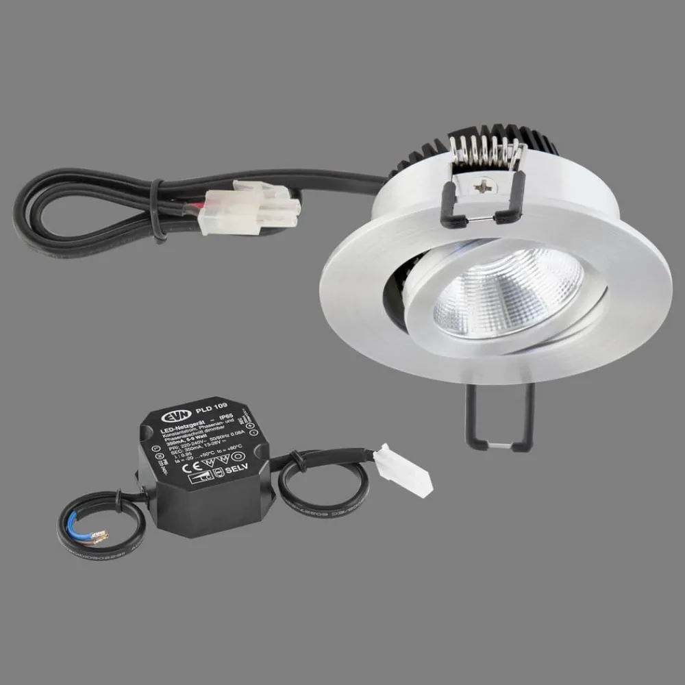 Drejelig LED-indbygningslampe PC20 med COB-LED og strømforsyning Den drejelige LED-indbygningslampe PC20 har et 30 cm langt tilslutningskabel med AMP-stik. Huset af pulverlakeret aluminium i høj kvalitet suppleres harmonisk af en skærm af klart glas. Anvendelsesmulighederne er mange: Med sin kraftige COB-LED er den velegnet til alle former for indendørs brug. Uanset om det er som rumbelysning, målrettet spotlight eller effektlys – enkeltvis eller i kombination bringer PC20-indbygningsarmaturet pålideligt lys ind i mørket – egnet til møbelkonstruktion (brandbeskyttelsesmærke MM) – COB LED – inkl. LED-strømforsyningsenhed (længde på tilslutningskabel 15 cm) – dæmpbar via forkant- og bagkantfasedæmper